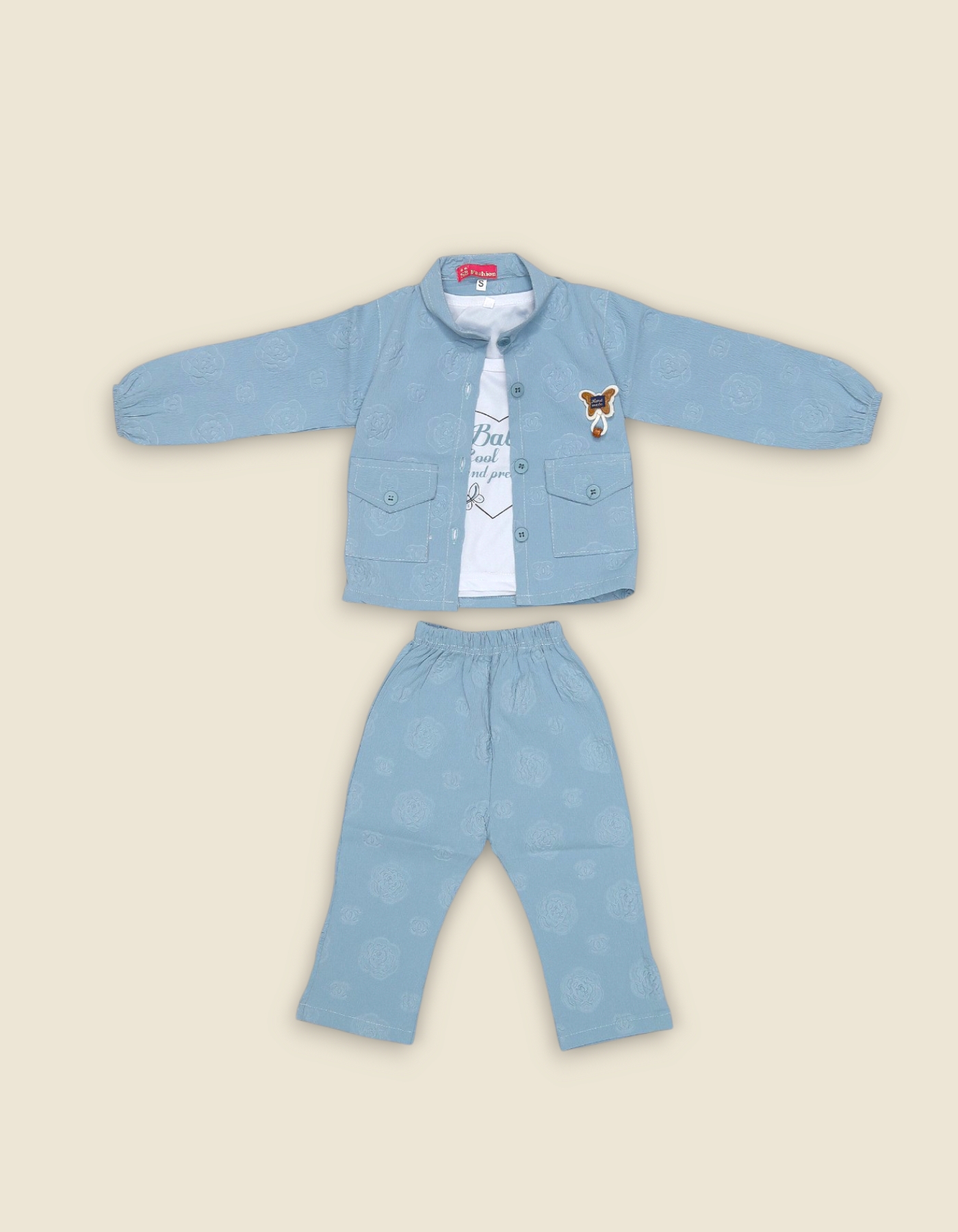 Stylish girls suit with floral jacket matching pants and soft inner shirt. Perfect for winter wear outings and gifting