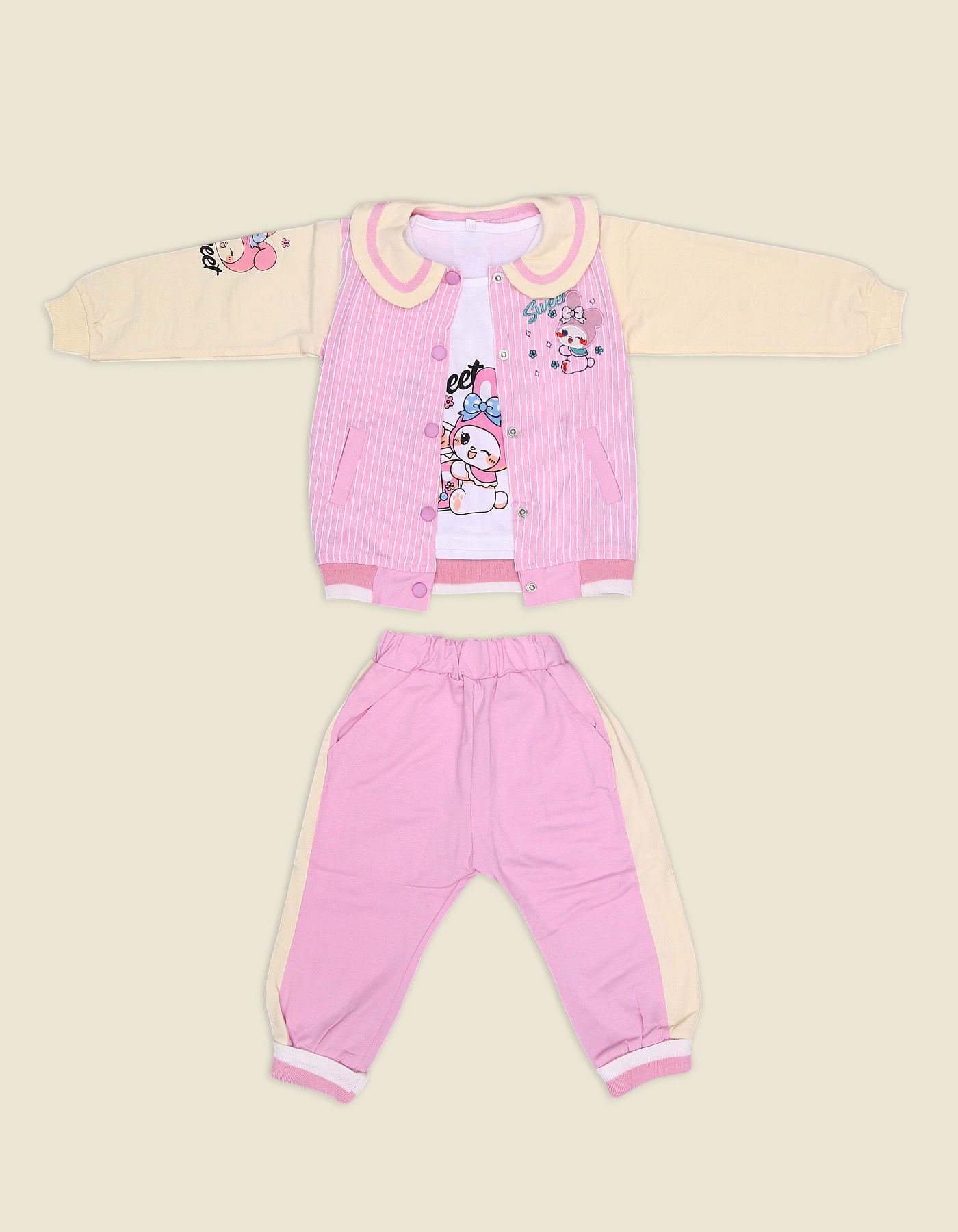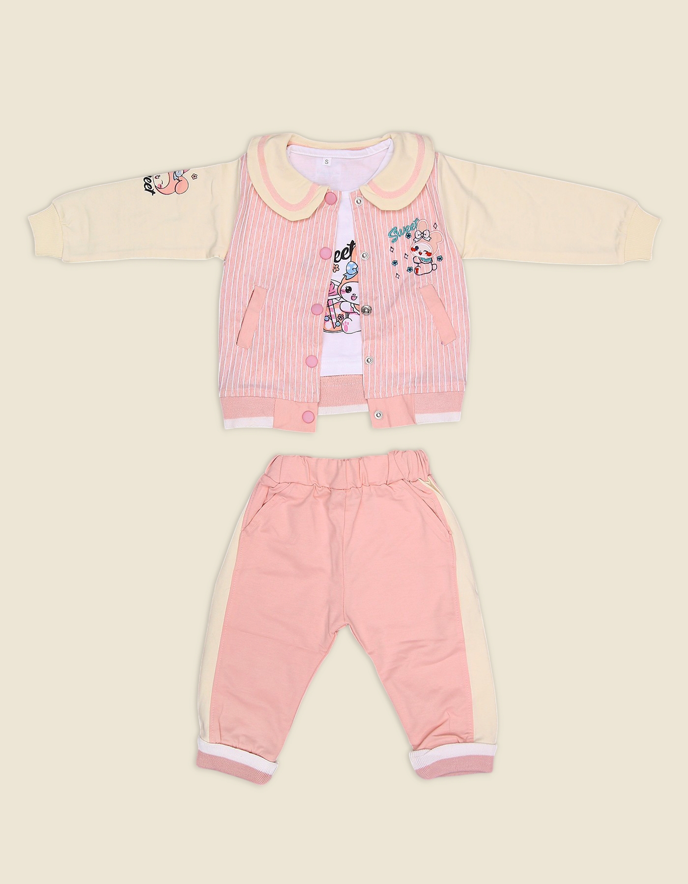 The Girls Sweet Bunny Suit is an adorable 3-piece outfit featuring a striped button-down jacket with cartoon bunny prints, a matching inner T-shirt, and comfy jogger-style pants with contrast side panels. The jacket comes with a Peter Pan collar and front pockets for a stylish, playful touch, while the pants ensure comfort with an elastic waistband and cuffed hems. Available in Baby Pink, Green, and Peach, this outfit is perfect for casual wear, playdates, and outings, keeping your little one both cute and comfortable.