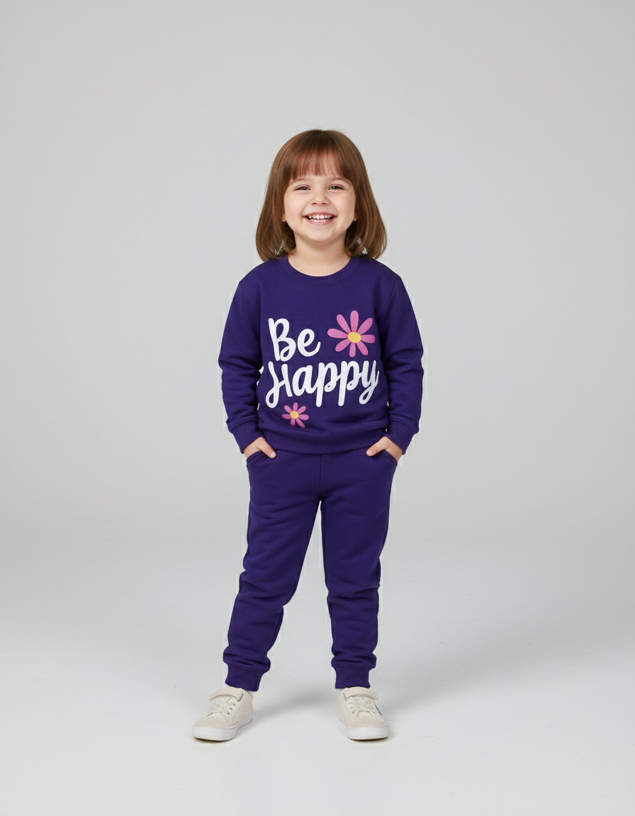 Vibrant girls track suit with Be Happy message and daisy flower graphics. Perfect for casual wear and gifting