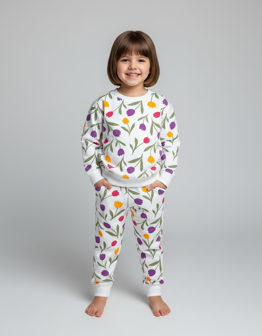 A vibrant two-piece outfit for girls featuring a white base with colorful tulip-style flowers and green leaves. Designed for comfort and charm, perfect for casual wear or sleepwear.