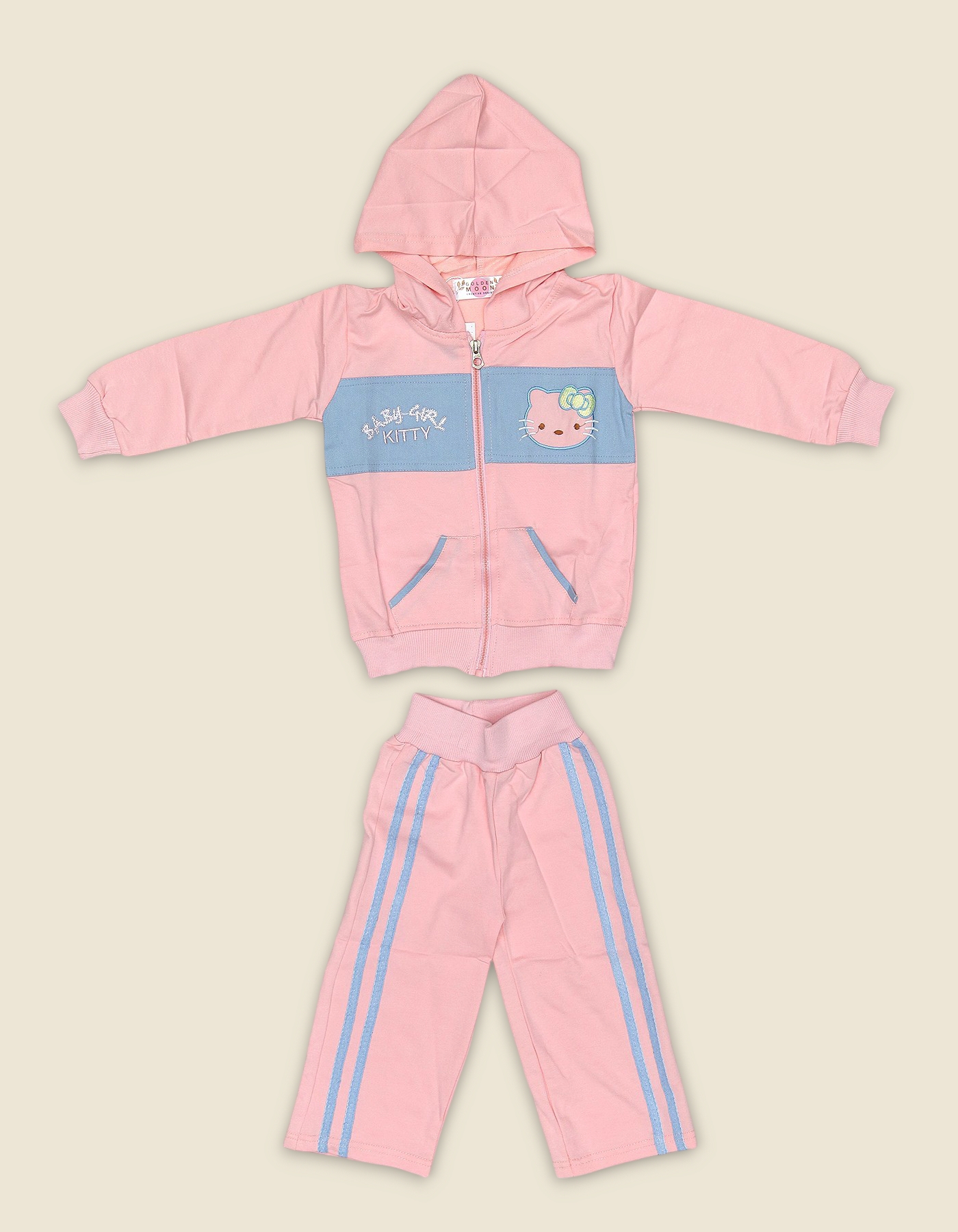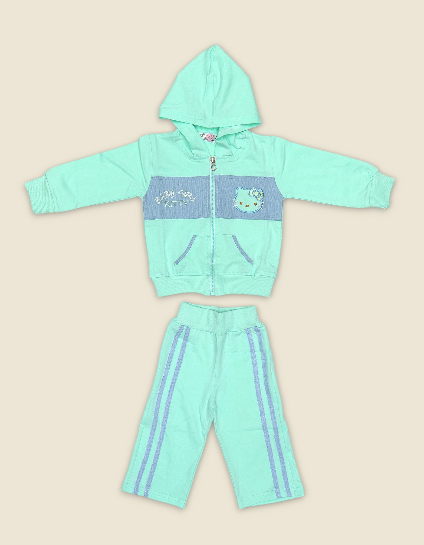 Cute and comfy two piece girls outfit including hooded jacket and matching pants. Designed with Hello Kitty graphics and blue stripe accents for a playful and trendy look.