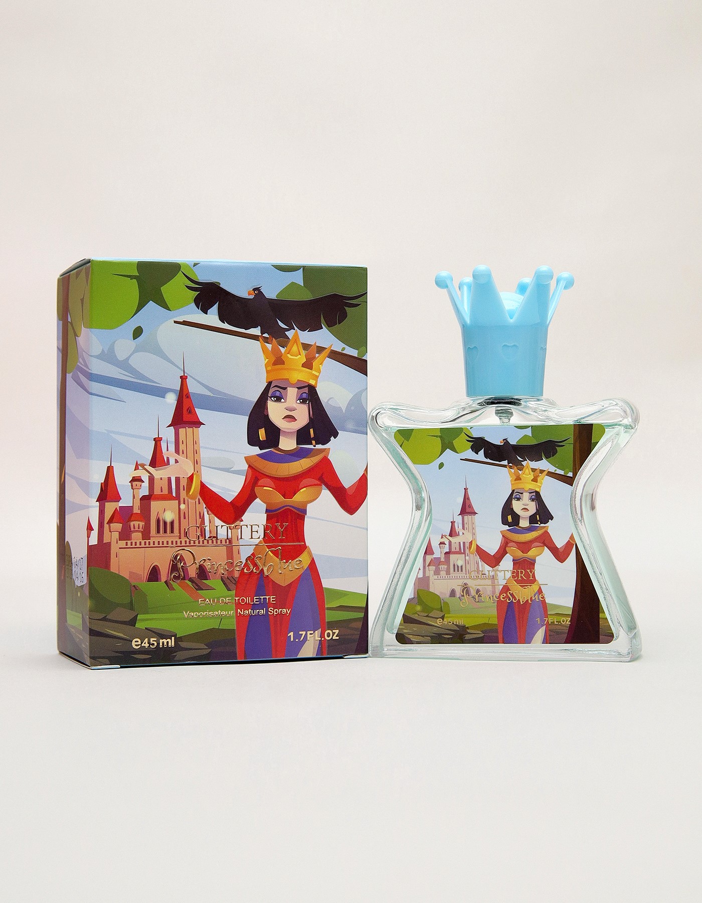 Embrace the bold and regal essence of Glittery Princess Love Eau De Toilette. Packaged in a sleek princess-inspired bottle crowned with a royal blue cap, this 45ml perfume embodies confidence, charm, and elegance. The enchanting artwork of a powerful princess in red with her castle and royal ravens makes it a must-have fragrance for girls who love a touch of royalty in their everyday life.