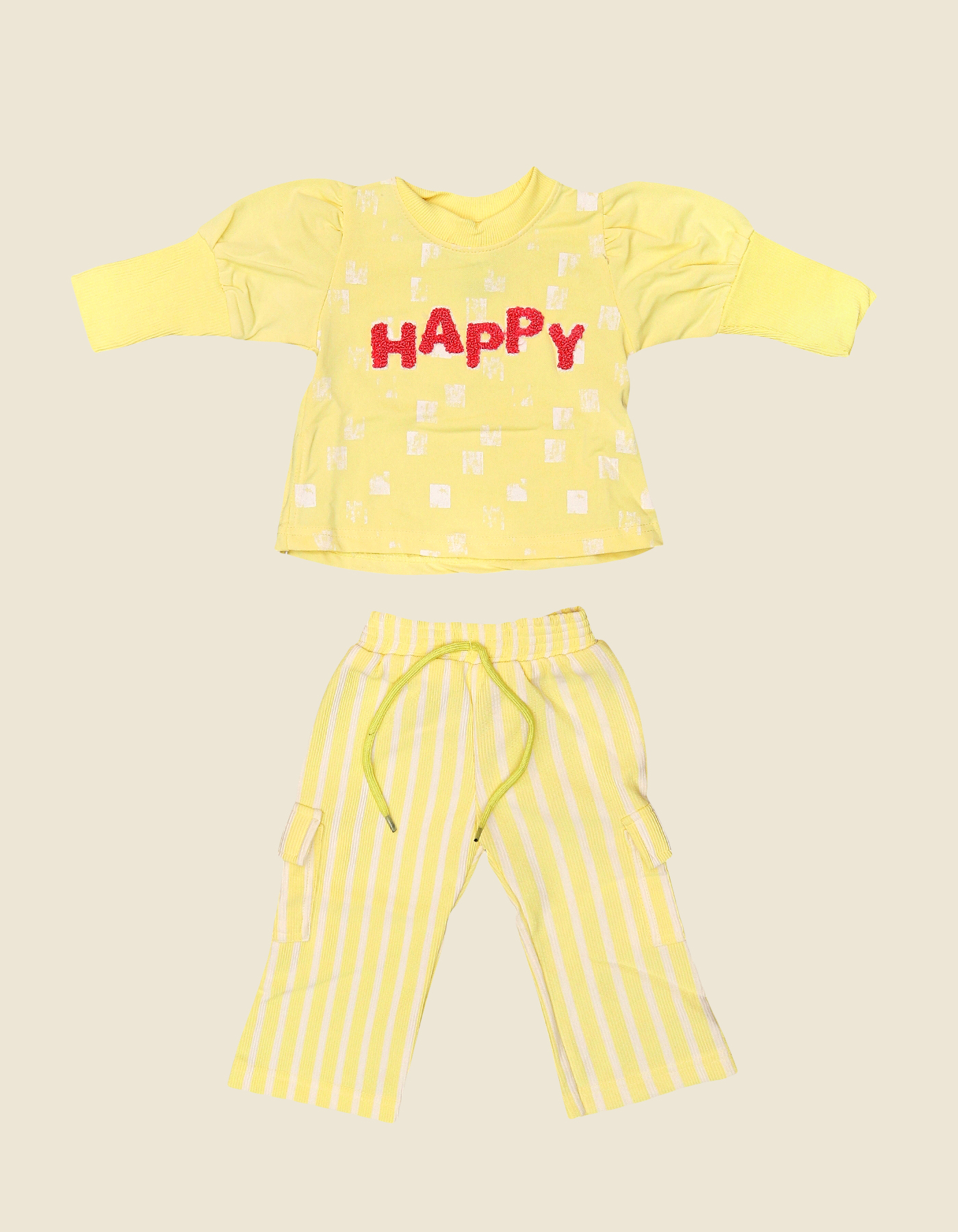 Brighten up your little one wardrobe with the Happy Vibes Baby Outfit Set. Designed for playful comfort, this two-piece set includes a puff-sleeve top with a bold HAPPY applique and matching striped cargo-style pants. Perfect for daily wear, playdates, and fun outings, this set keeps your baby stylish and cheerful in every moment. Available in Parrot Green and Yellow.