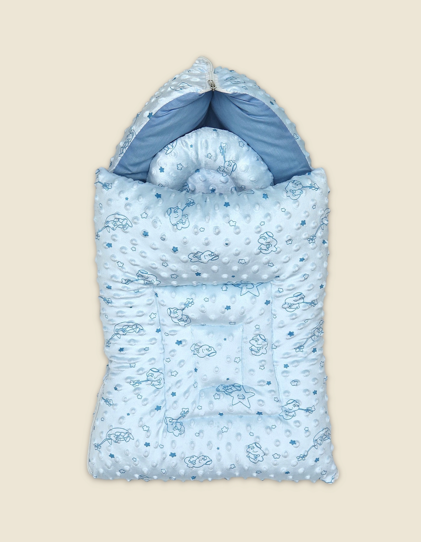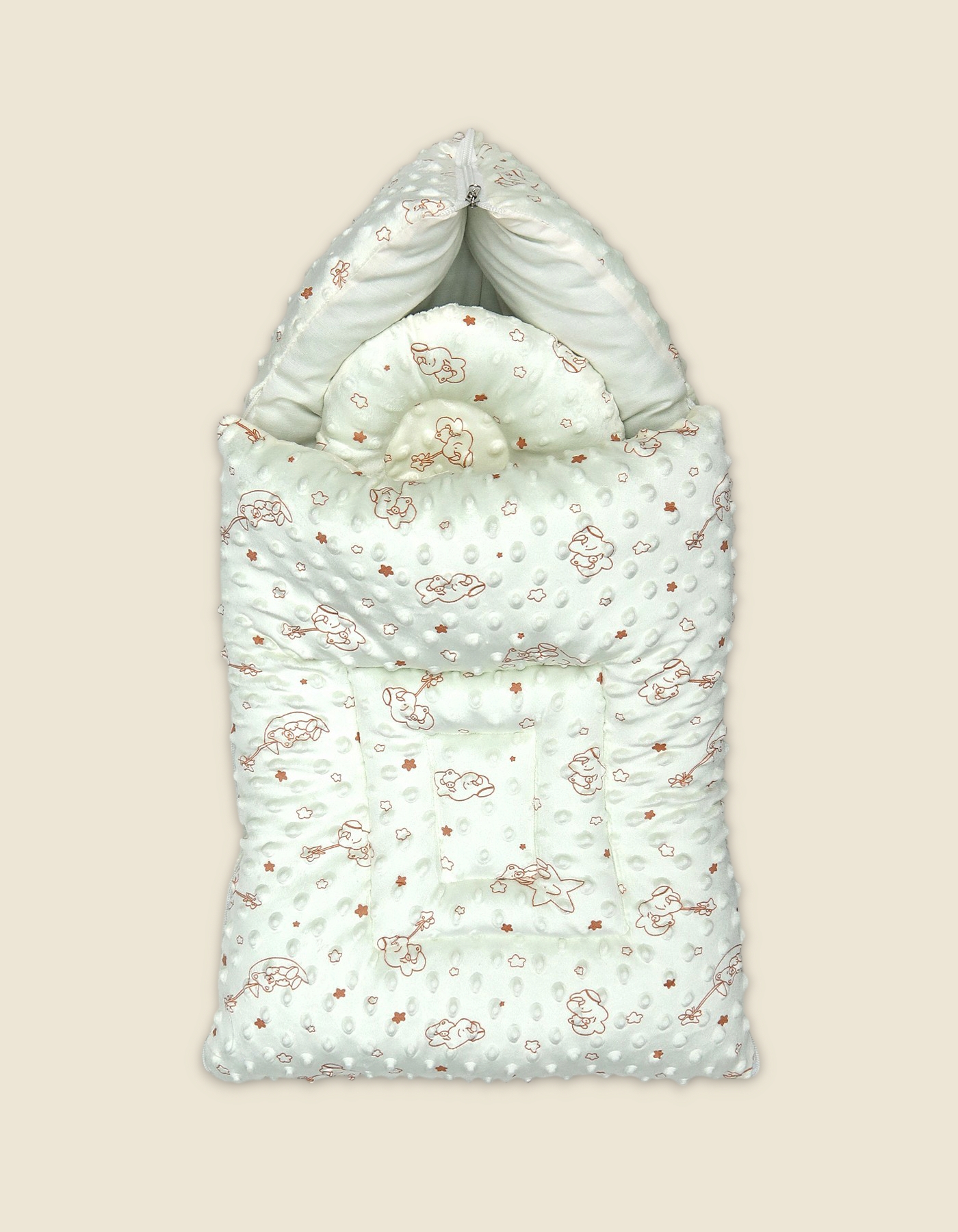 Plush, hooded baby sleeping bag with raised dotted texture and tiny character/stellar print — available in soft ivory and light blue. Padded, quilted, and designed to keep newborns and infants warm during stroller rides, naps, or travel.