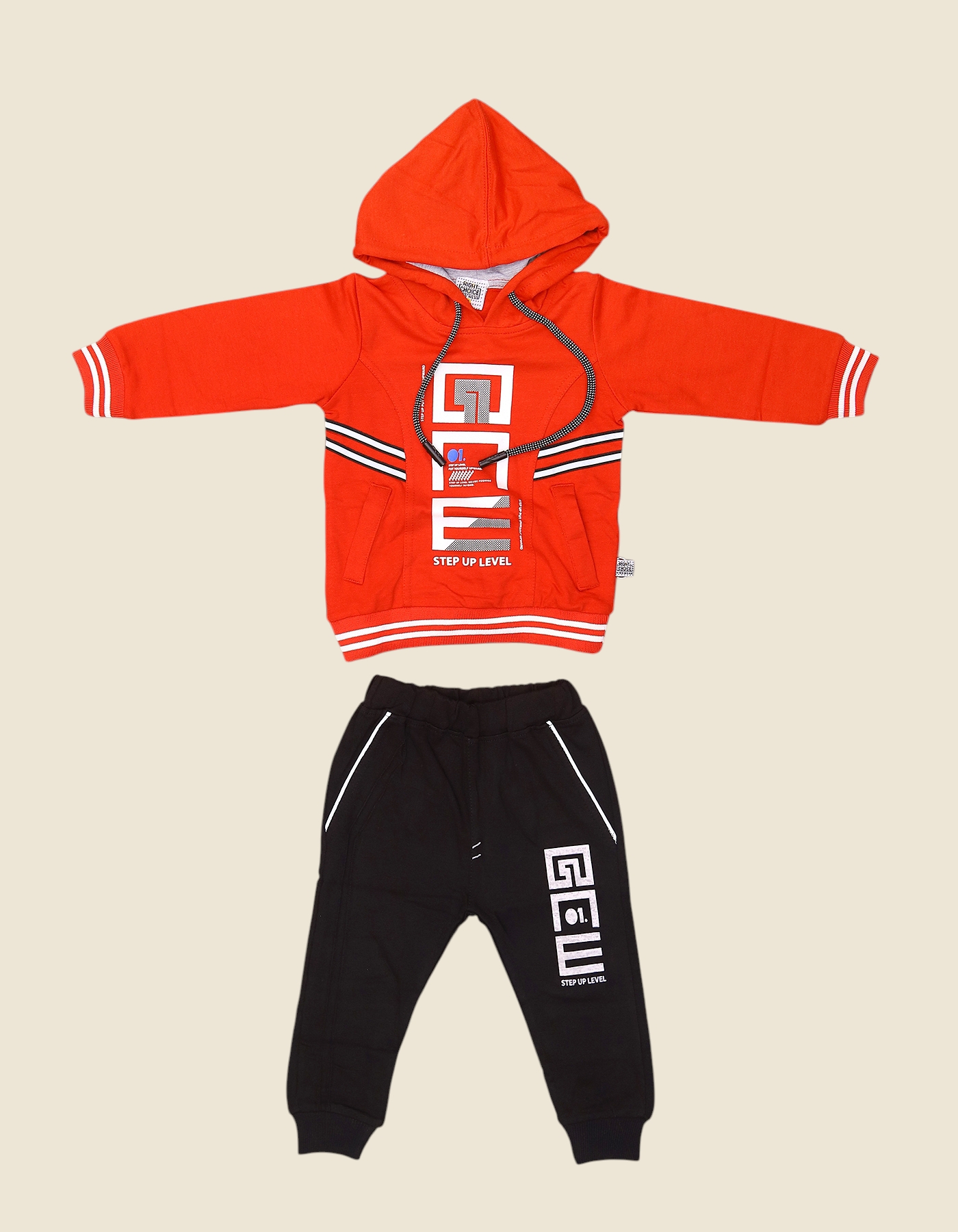 Soft hooded sweatshirt with front pocket and contrast stripe detail paired with elastic waist joggers. Available in blue red and yellow tops with black joggers. Sporty comfortable everyday wear for kids.