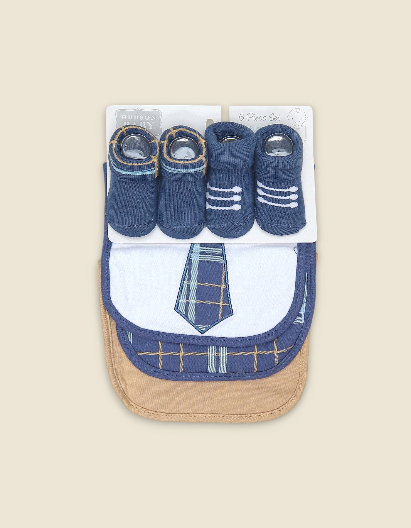 Coordinated baby set with bibs and socks in formal themed designs. Perfect for newborn boys, feeding and gifting.