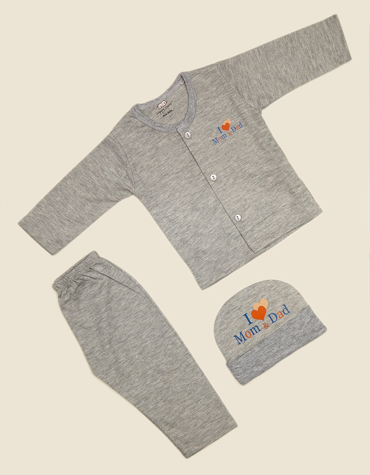 Keep your baby cozy and stylish with this three-piece newborn suit set, featuring a button-up top, soft elastic pants, and a matching cap. The I Love Mom & Dad design adds a heartwarming touch, making it perfect for everyday wear or gifting. Crafted from soft, breathable, and baby-friendly fabric, it ensures comfort and warmth all day long.