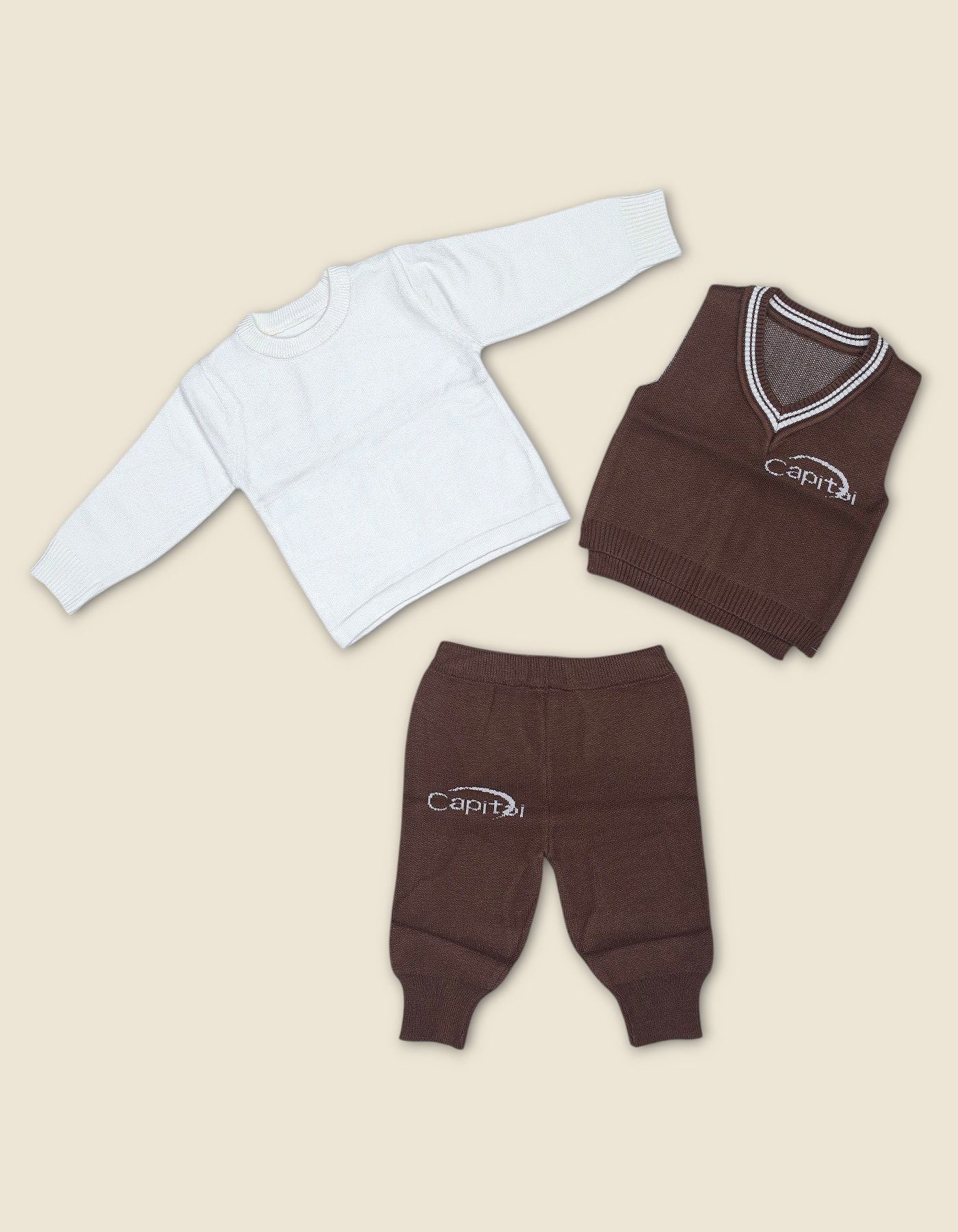 Complete Set: Includes a button up cardigan and comfortable solid brown trousers.
