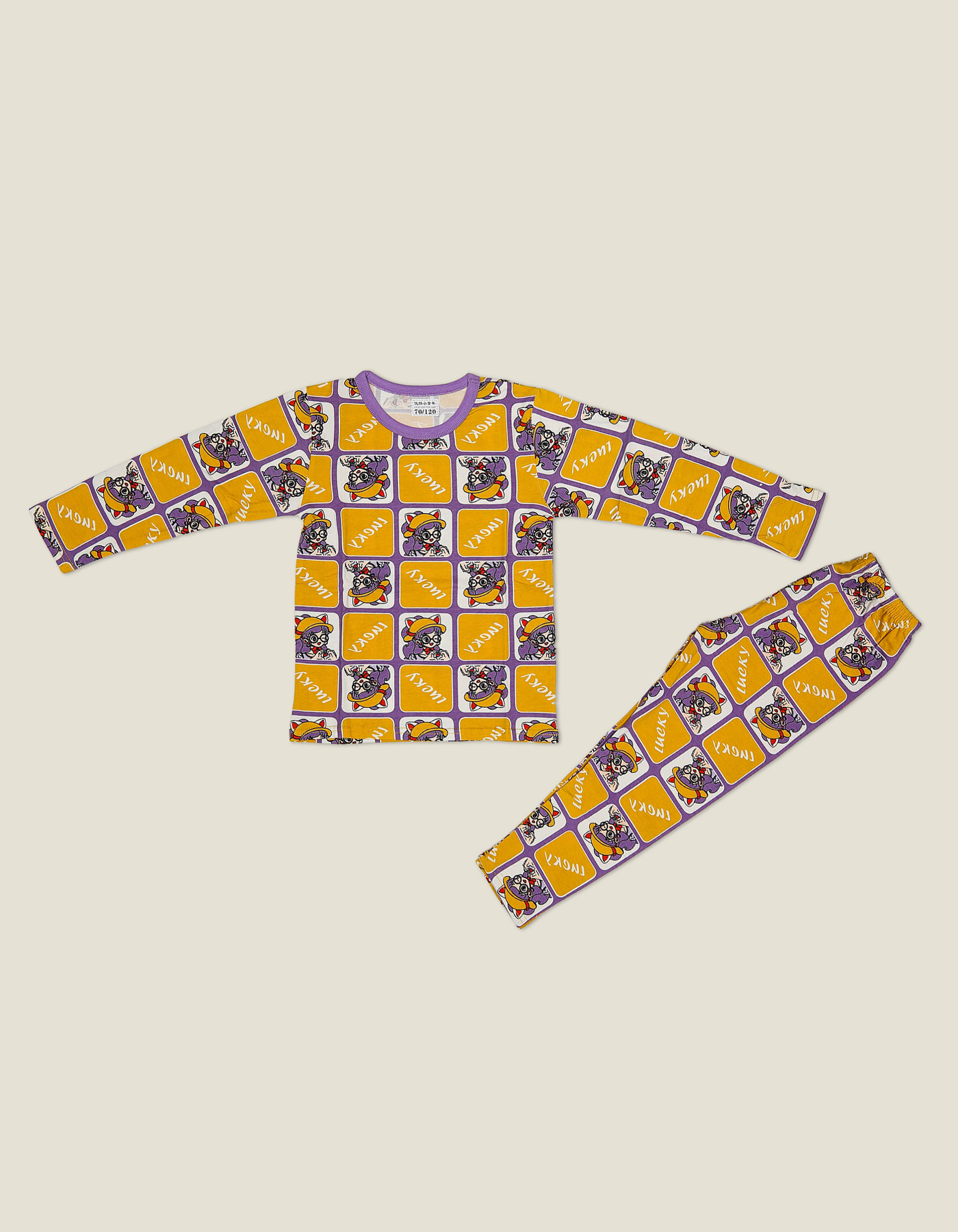 Add a playful pop of color to your child’s wardrobe with this vibrant cartoon suit. Featuring a mix of purple and yellow tones with Lucky prints and fun cartoon characters, this outfit is both eye-catching and super comfy.