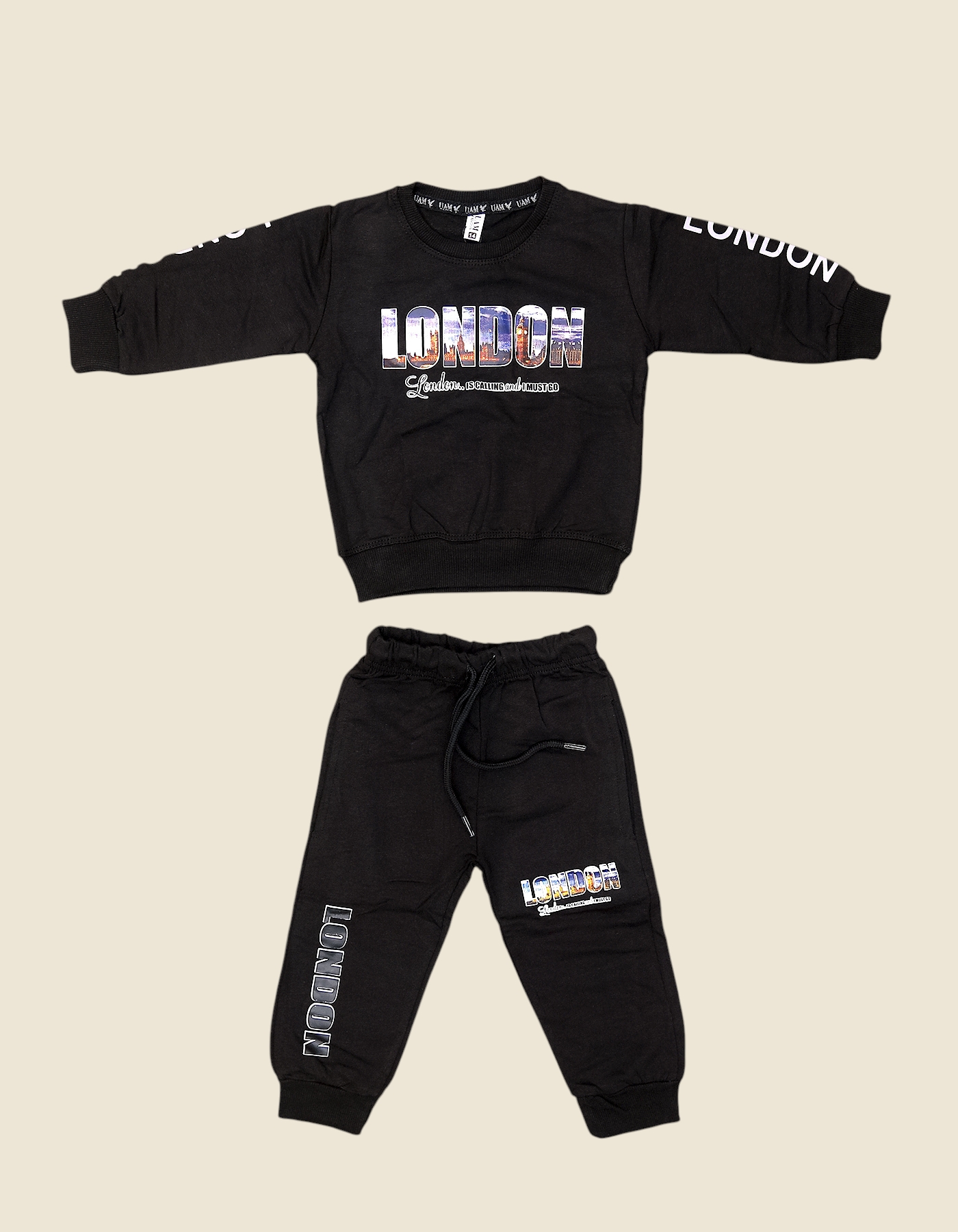 Casual two piece set with crew sweatshirt and elastic waist joggers featuring london print on chest sleeve and leg. Available in black and yellow. Comfortable everyday outfit for toddlers and young kids.