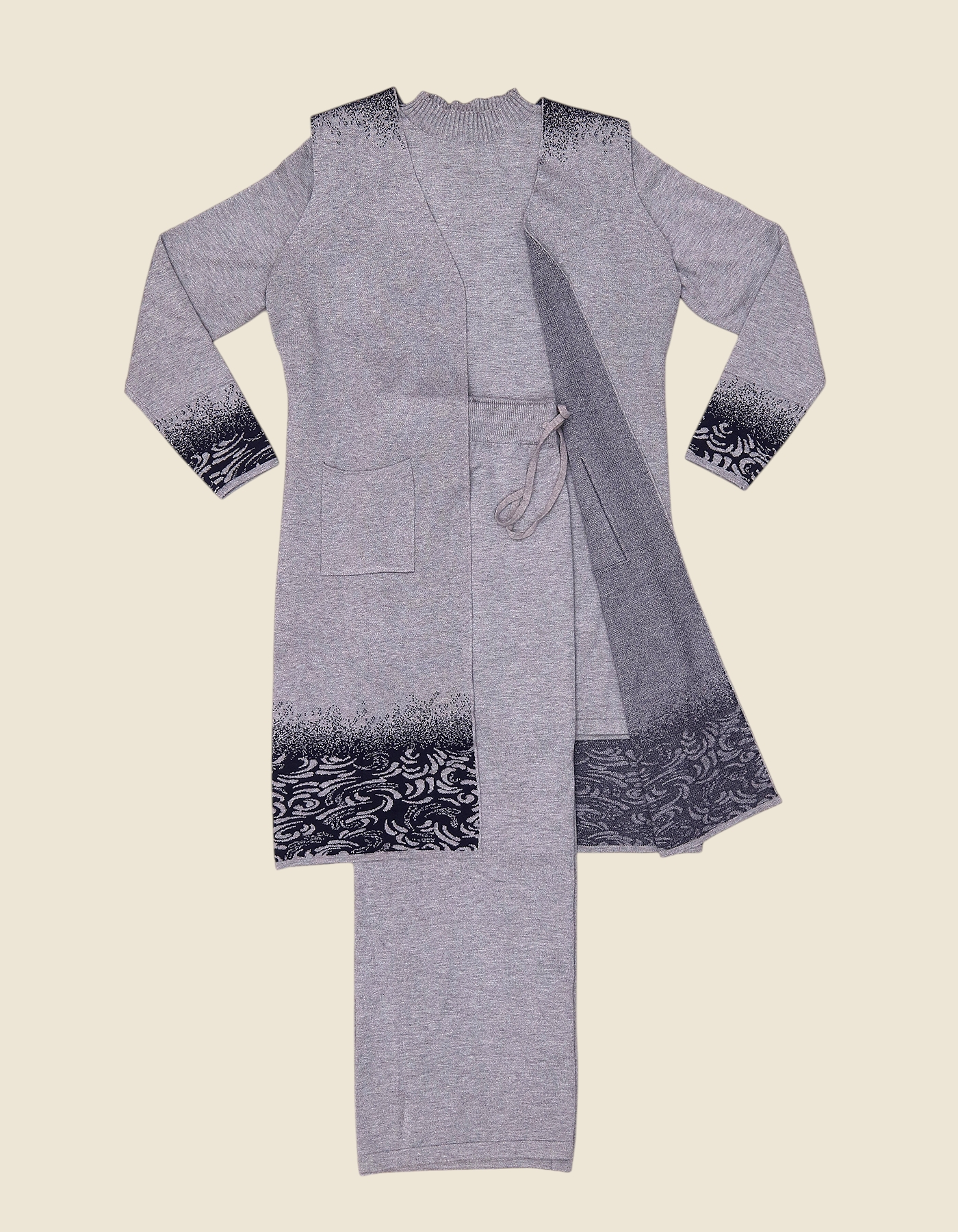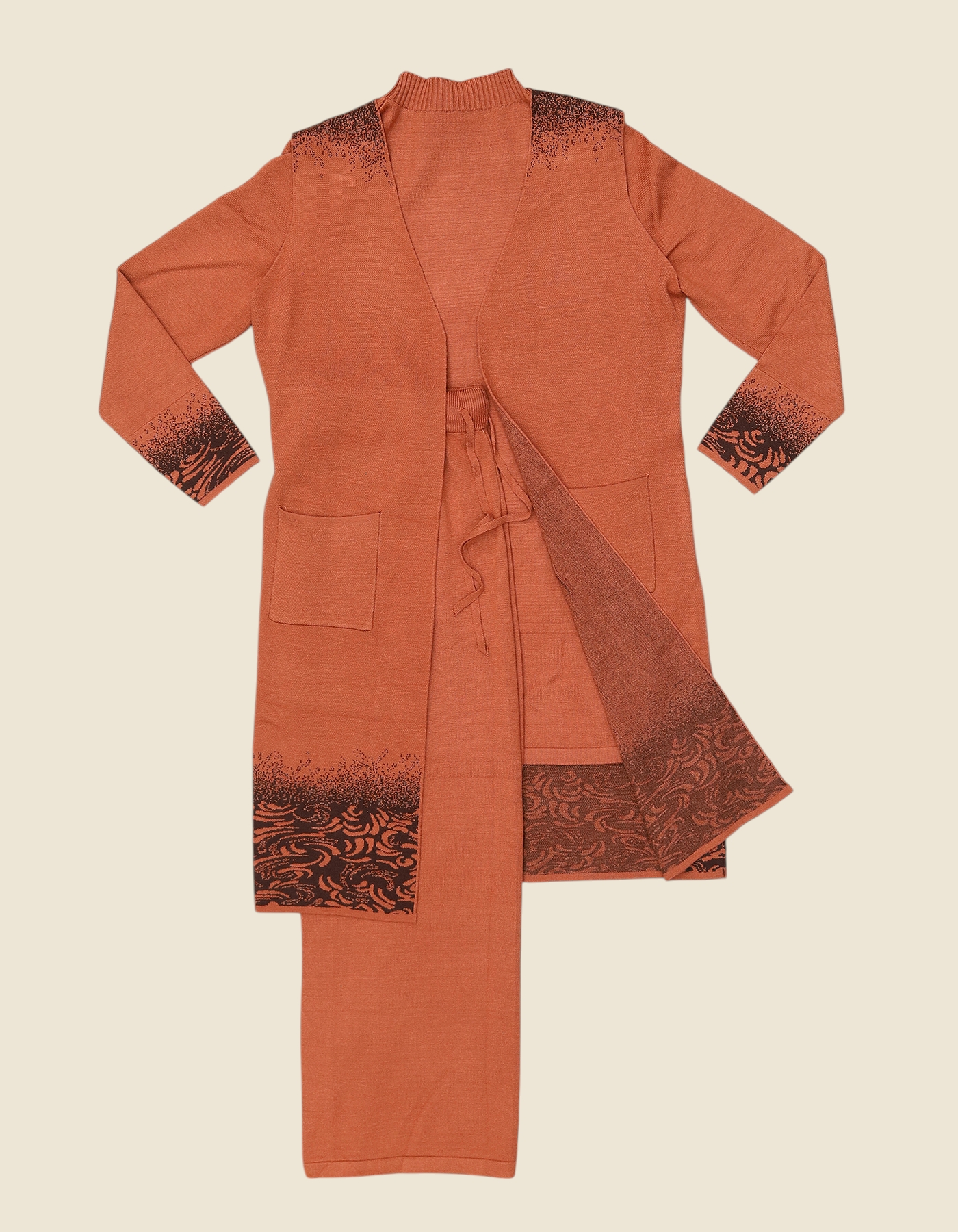 Make a bold fashion statement with this stylish 3-piece ladies co-ords set. Featuring a cozy high-neck inner, comfortable trousers, and a long open-front printed cardigan with a tie belt, this outfit blends elegance with practicality. The intricate printed detailing on the sleeves, hemline, and cardigan edges adds a touch of sophistication, making it perfect for winter outings, office wear, or semi-formal occasions.