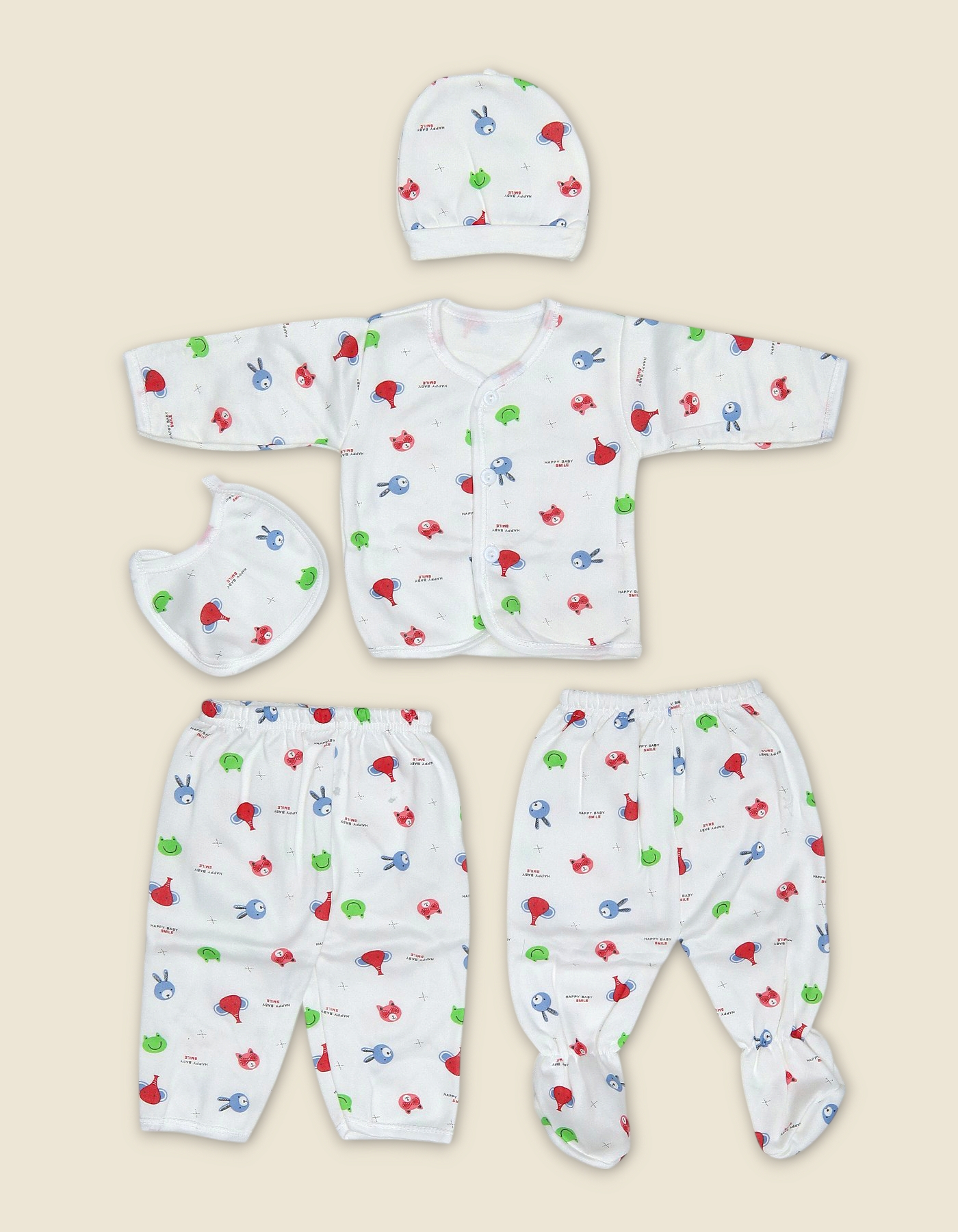 Soft cotton newborn set with matching cap, bib, button-down shirt and two pants (one footed, one regular) in an all-over multicolour animal print.