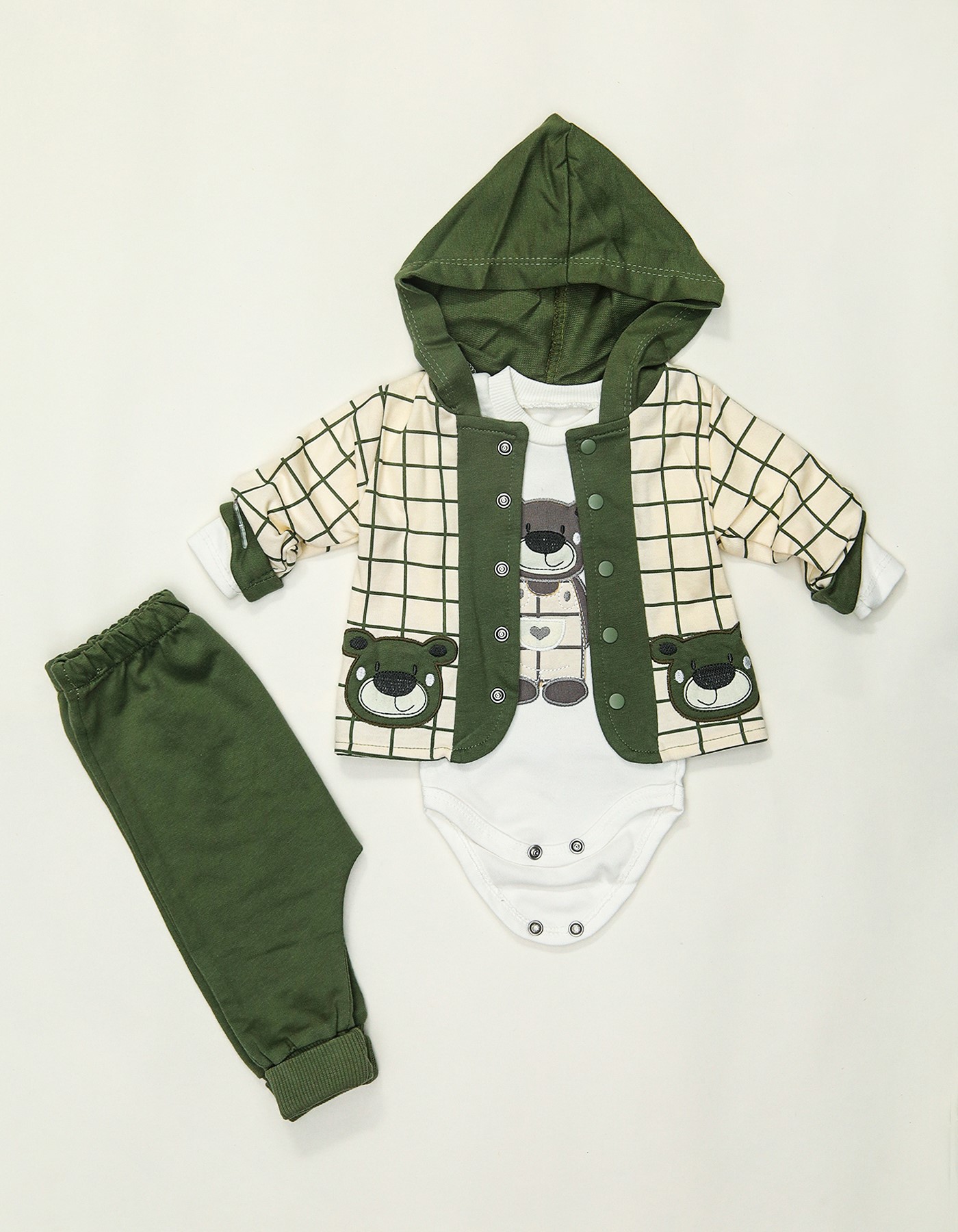 Dress your baby boy in this adorable 3-piece hoodie set, perfect for everyday wear or special outings. This set features a forest green hoodie with a cute bear design, a soft white bodysuit, and matching jogger pants. Made from gentle, breathable fabric, it ensures all-day comfort while keeping your little one stylish and cozy.