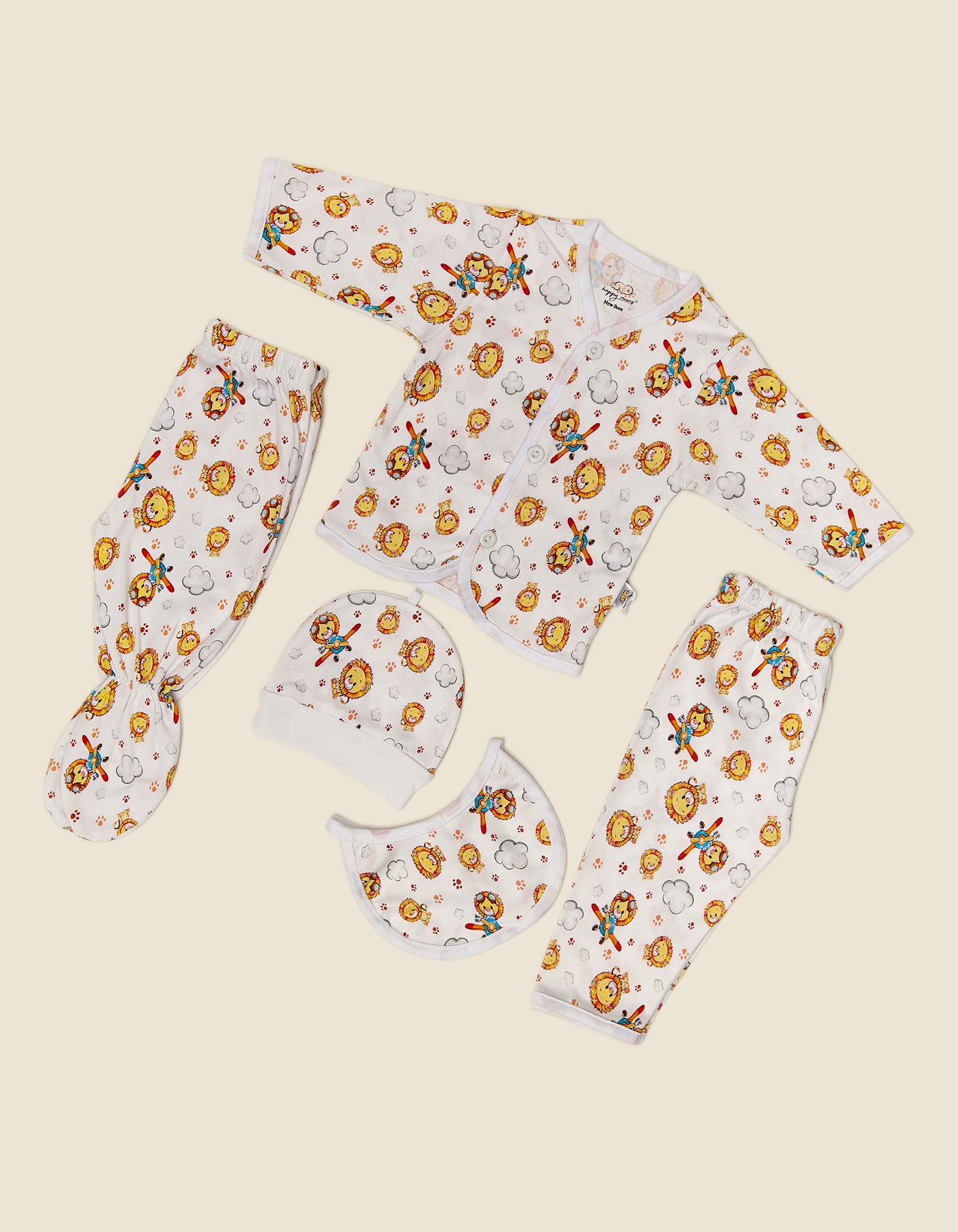 This 5-piece newborn essentials set is designed to keep your little one cozy, stylish, and comfortable all day long. Available in two soft colors — Peach and White, this set includes a button-down shirt, footed pajama, pants, a cute cap, and a matching bib. The playful lion print adds a fun, adorable touch while the soft, breathable fabric keeps your baby’s delicate skin safe and irritation-free.