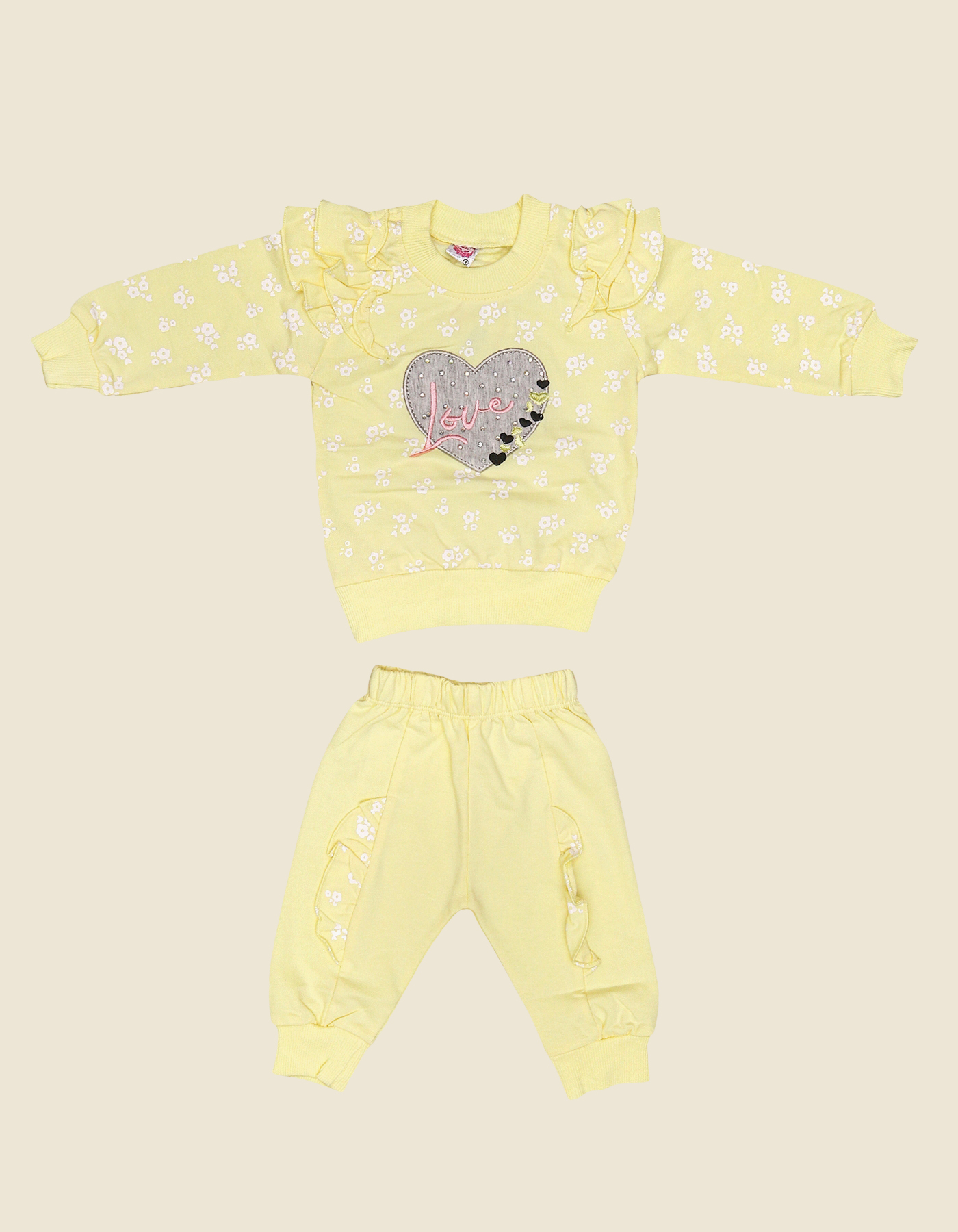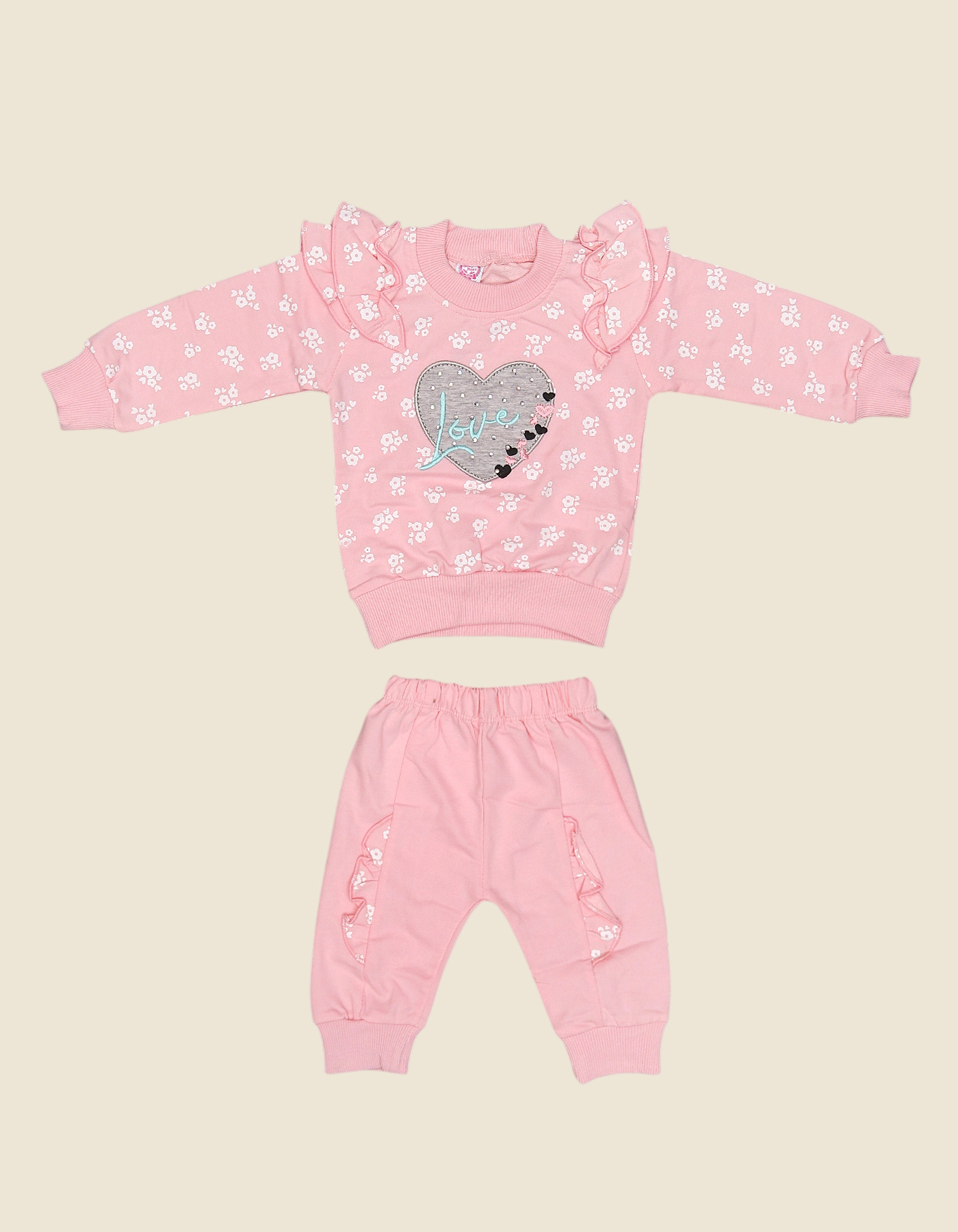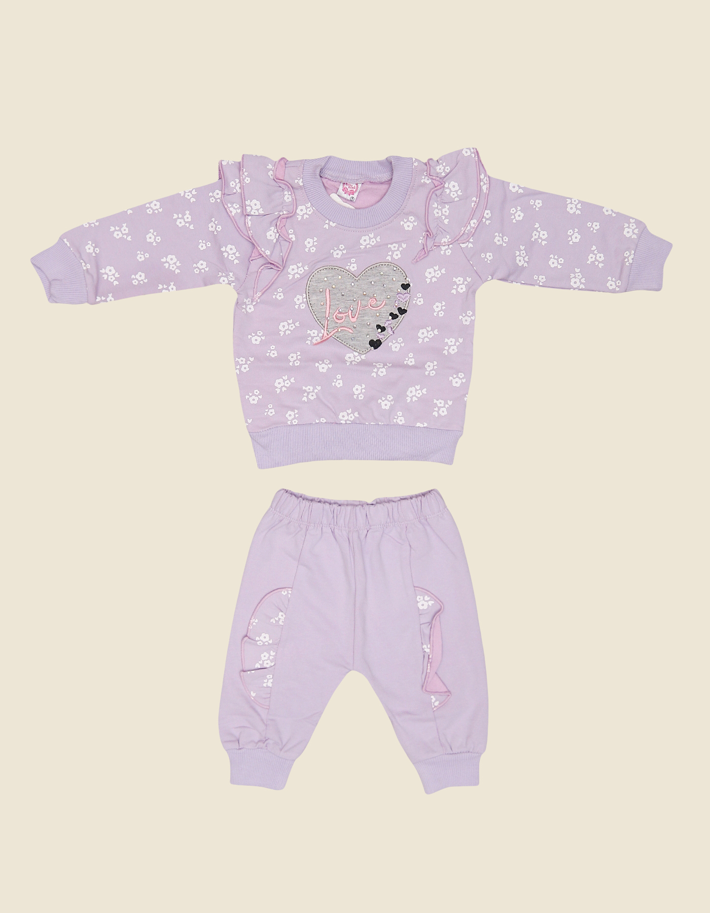 Dress your little one in style with the Love Heart Ruffle Baby Outfit Set. This adorable two-piece features a floral-printed sweatshirt with frilly ruffle shoulders and a glittery heart motif with Love embroidery, paired with comfy jogger pants that have matching ruffle accents. Perfect for casual outings, playdates, or cozy home wear, this set brings charm, comfort, and cuteness together. Available in Pink, Purple, and Yellow colors.