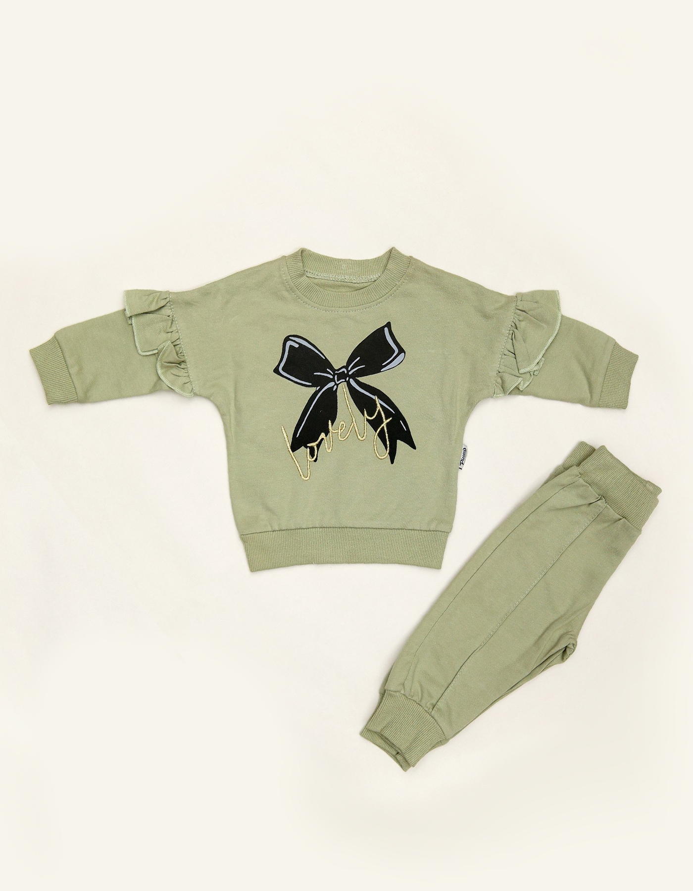 Stylish and cute, this girls suit is designed with a bold bow and Lovely print on a soft green base. With ruffle sleeve details and matching joggers, its perfect for everyday fashion and comfort.