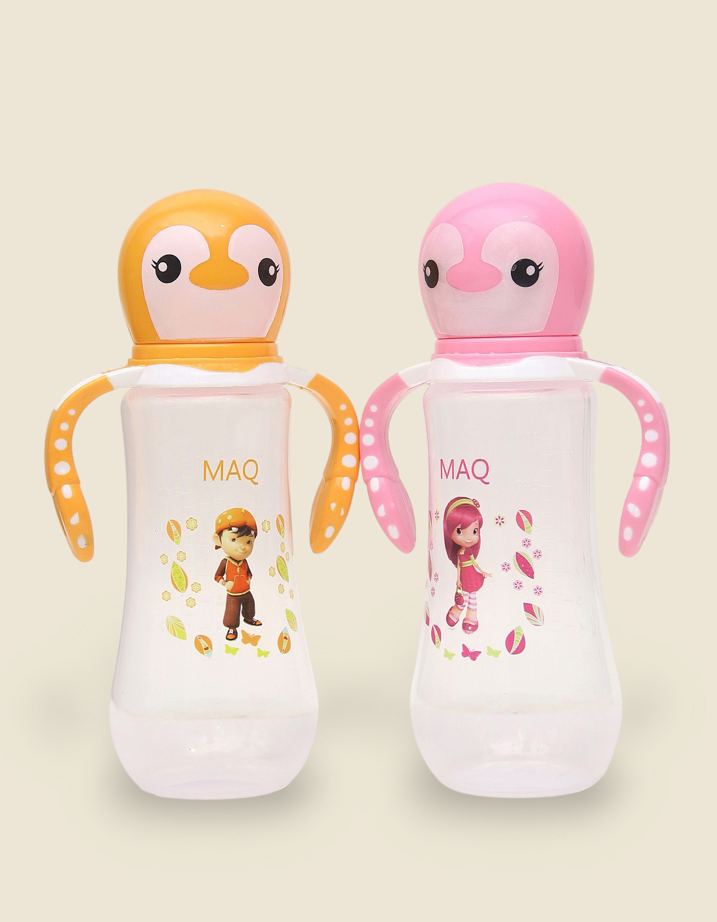 The MAQ Penguin Baby Feeder Bottles make feeding both fun and practical. Featuring a cute penguin-shaped cap, vibrant cartoon prints, and dual ergonomic handles, these bottles help toddlers learn to hold and drink independently. Made from BPA-free, food-grade plastic, they are safe for everyday use and easy to clean, making them the perfect choice for both home and travel.
