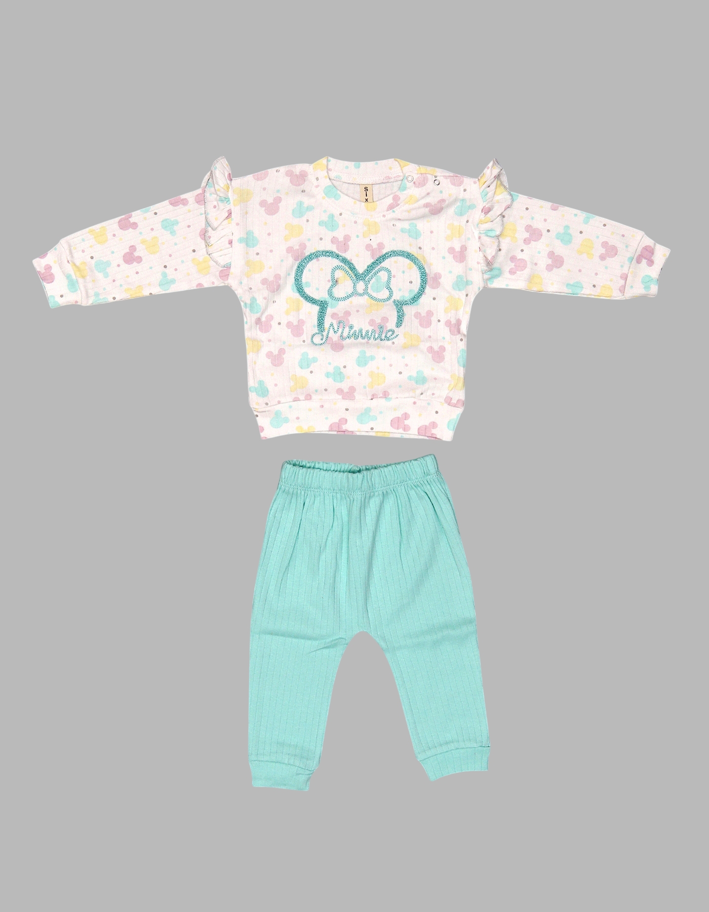 The Minnie Bow Baby Outfit Set is a delightful mix of cuteness and comfort for your little one. Featuring a printed sweatshirt with colorful Minnie Mouse silhouettes, ruffle details on the shoulders, and a big bow design at the center, paired with matching soft pants, this set is perfect for everyday wear. Designed with lightweight and breathable fabric, it keeps your baby comfy while looking super stylish. Available in Baby Pink and Ferozi color options.