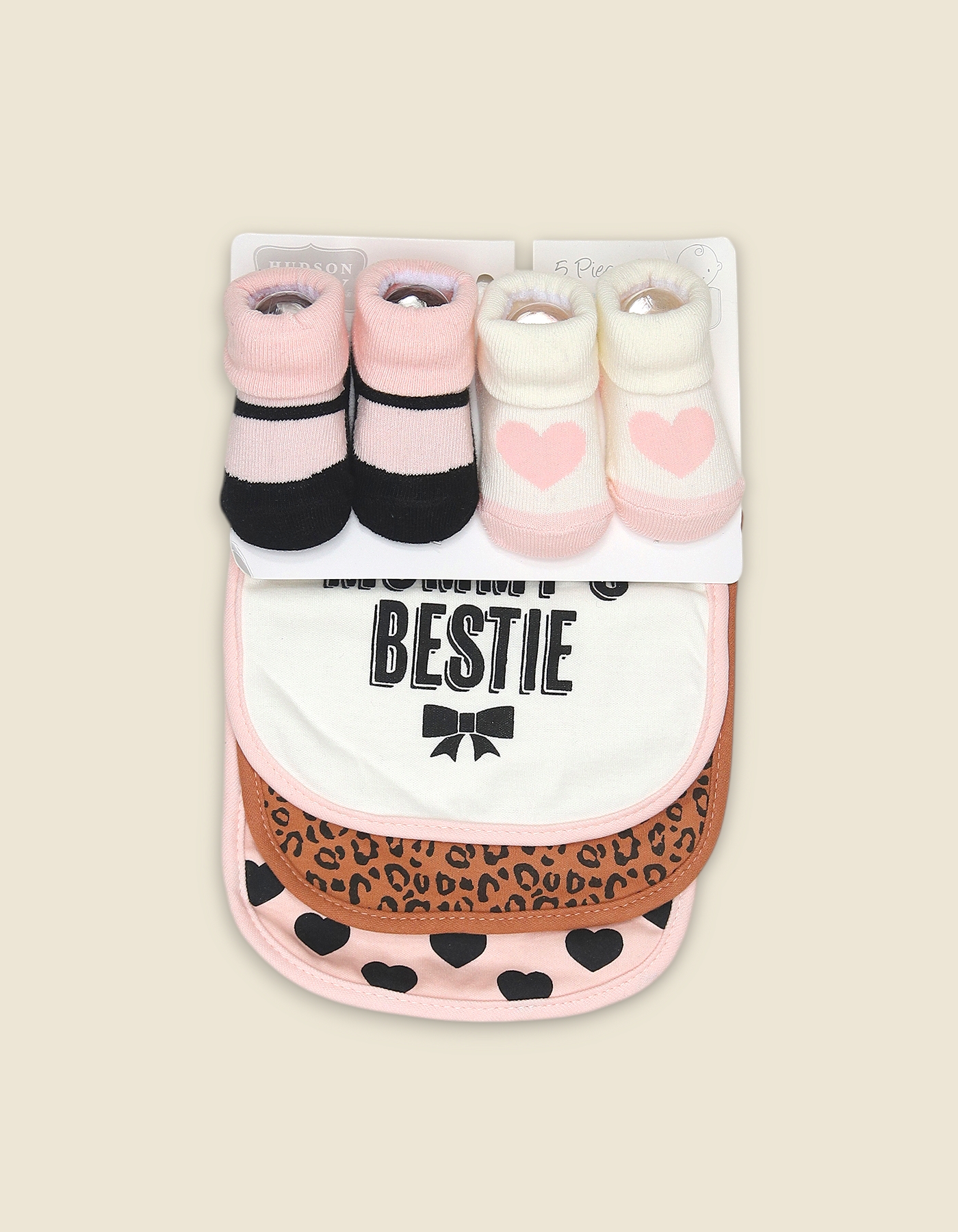 Coordinated baby set with bibs and socks in stylish prints. Perfect for newborn girls, feeding and gifting.