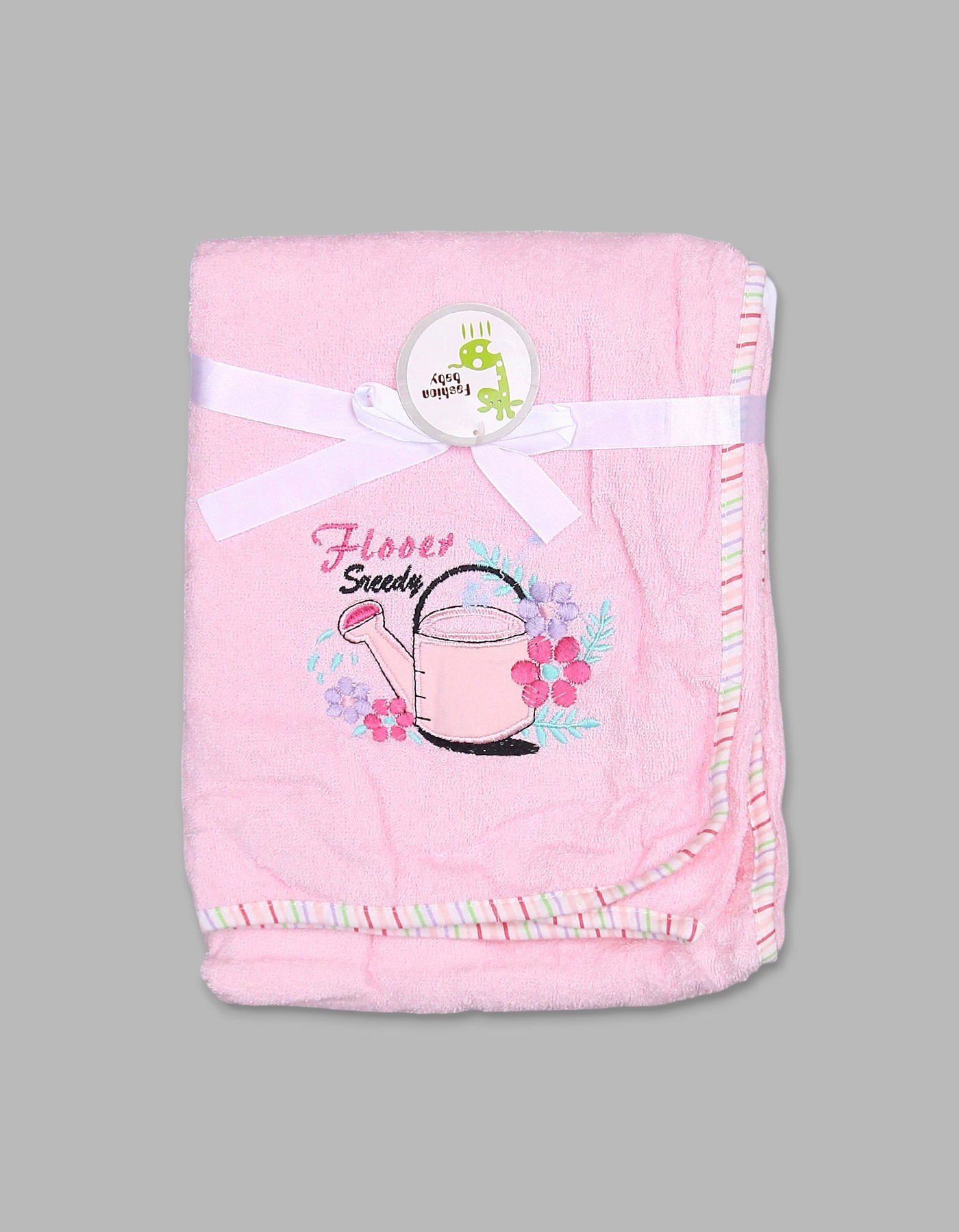 Keep your baby warm and cozy after bath time with this soft baby pink towel featuring a sweet watering can and flower embroidery. Its gentle fabric ensures comfort for delicate skin, while the striped trim adds a playful finish. Perfect for newborns and toddlers.