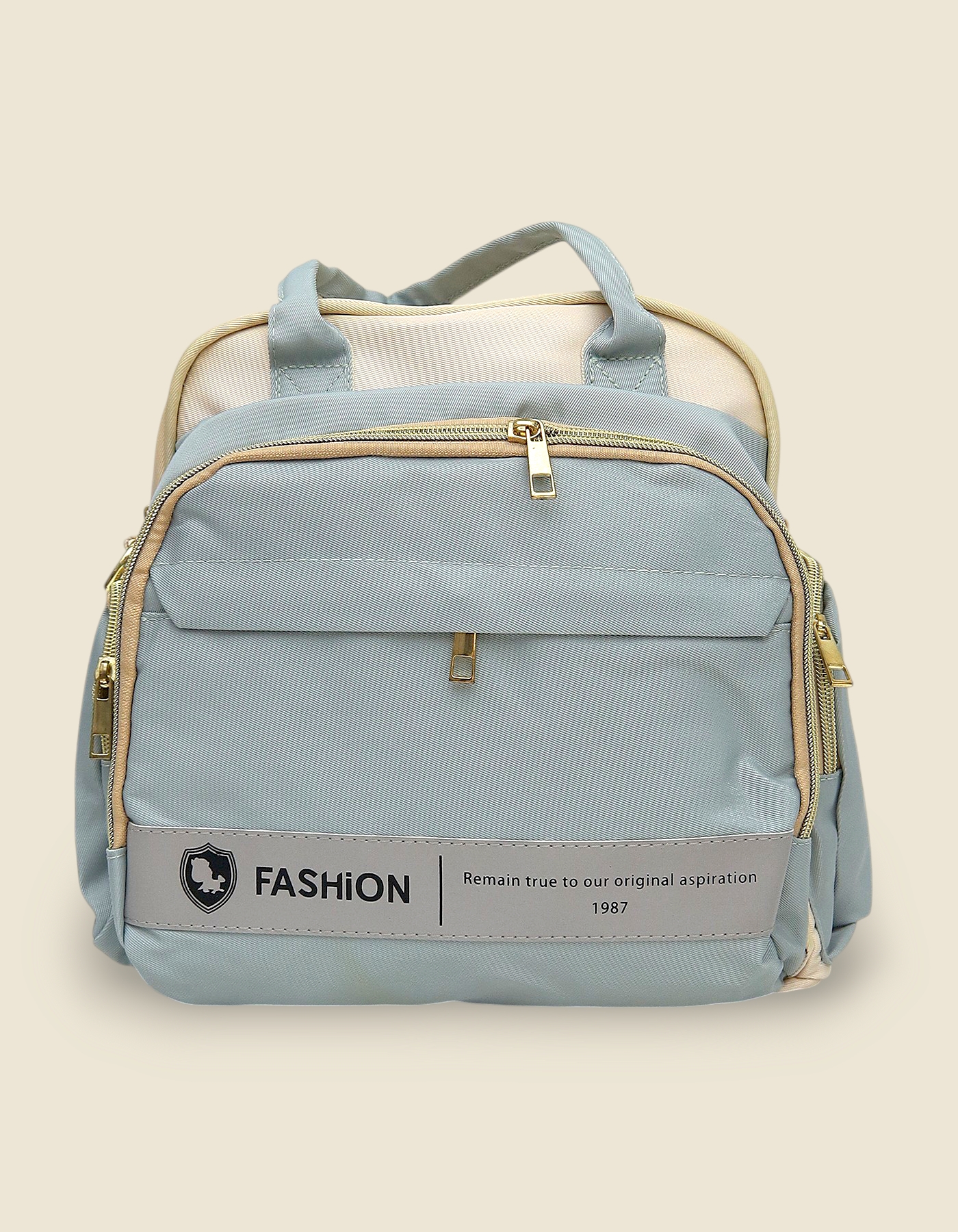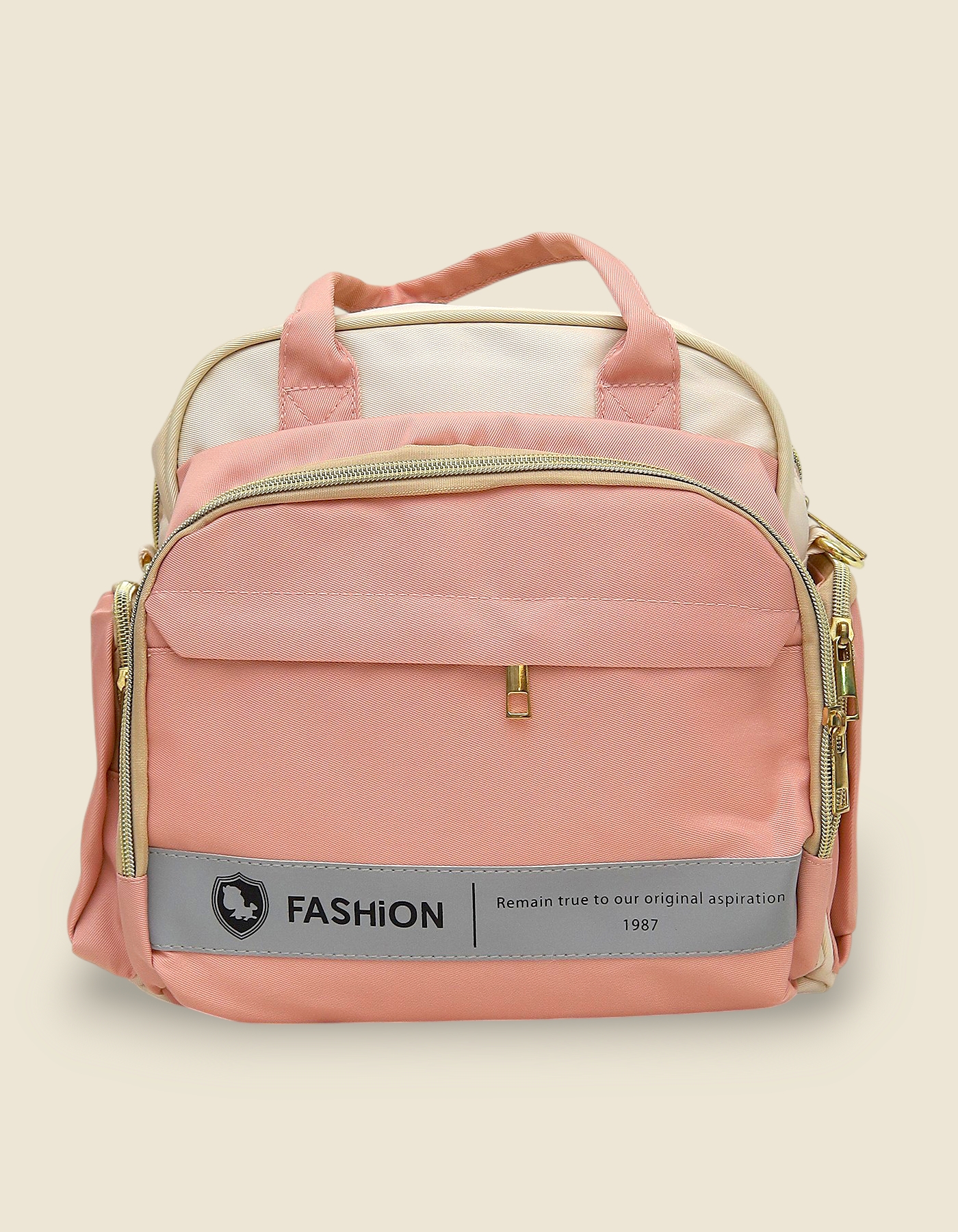 This versatile travel bag is available in Peach or Green. It features a spacious main compartment, side bottle pockets, and a front zip pouch with a reflective safety strip. Crafted from water-resistant nylon, it is a durable choice for travel or baby essentials.