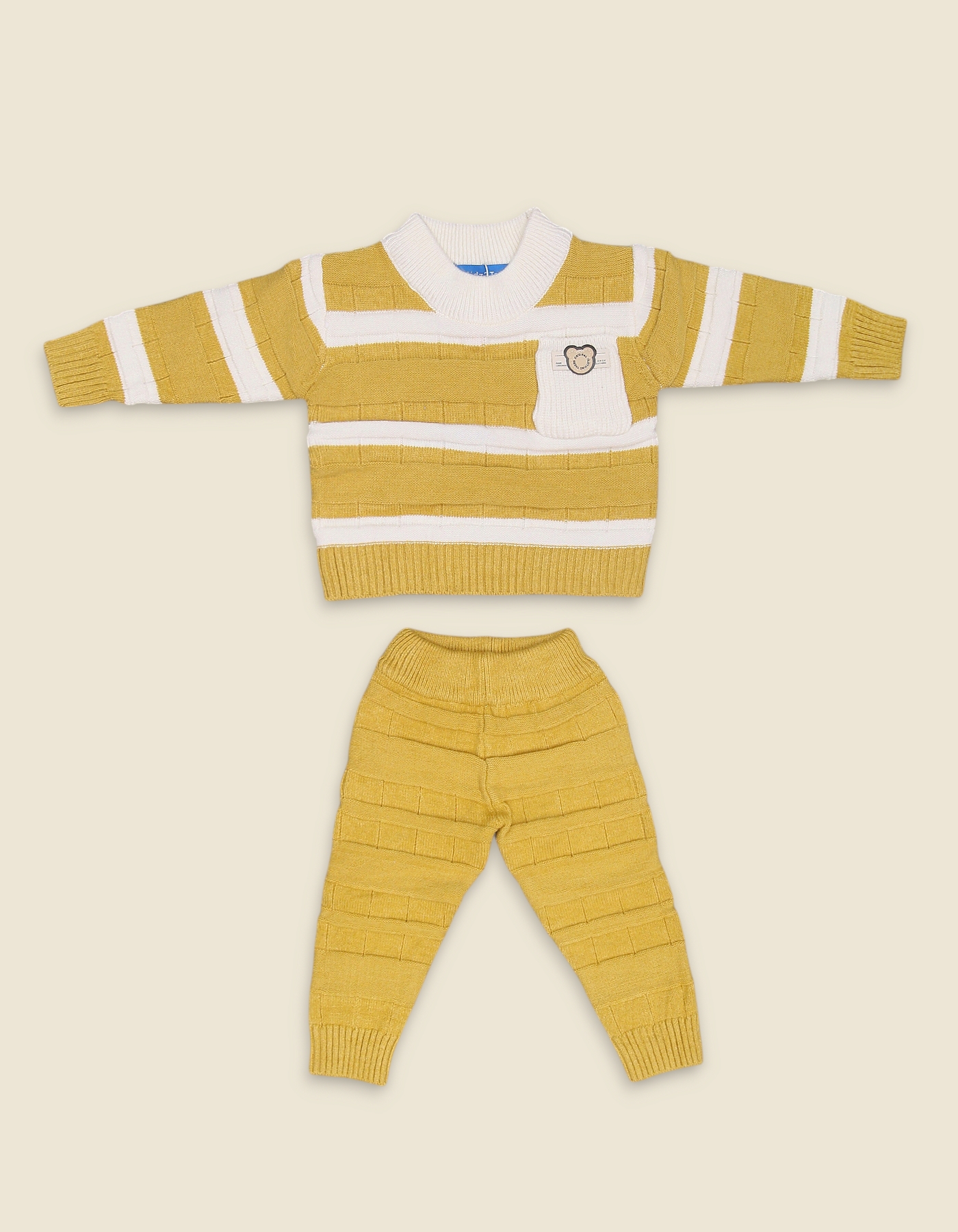 Add a touch of warmth and charm to your childs winter wardrobe with this mustard yellow woolen knit suit. The sweater features wide mustard and white stripes with a cute teddy face patch on the chest pocket, paired with matching textured knit pants. Cozy, durable, and stylish, this set is ideal for everyday winter wear, outings, or special occasions.