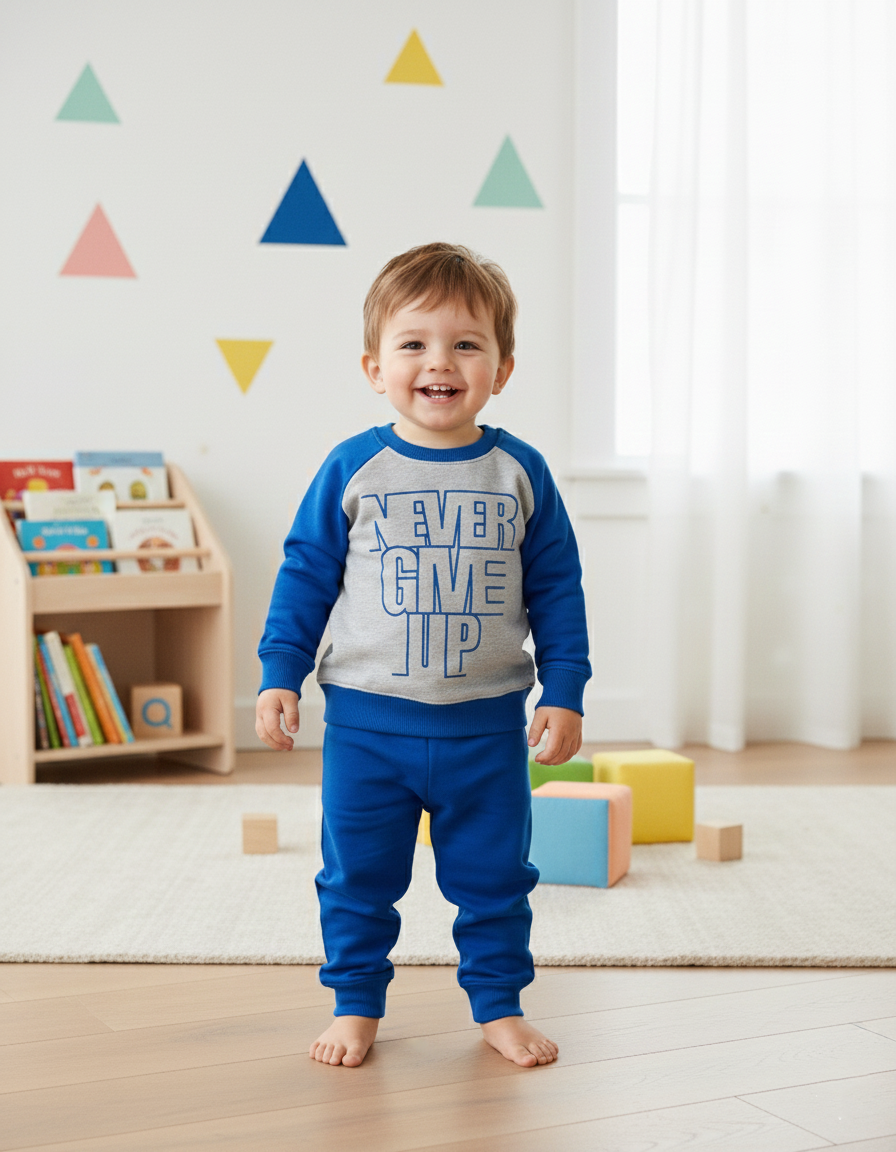 Motivational and stylish, this boys tracksuit is designed to keep kids active and confident. Featuring a bold Never Give Up slogan on a two-tone sweatshirt, it offers comfort with a sporty look.