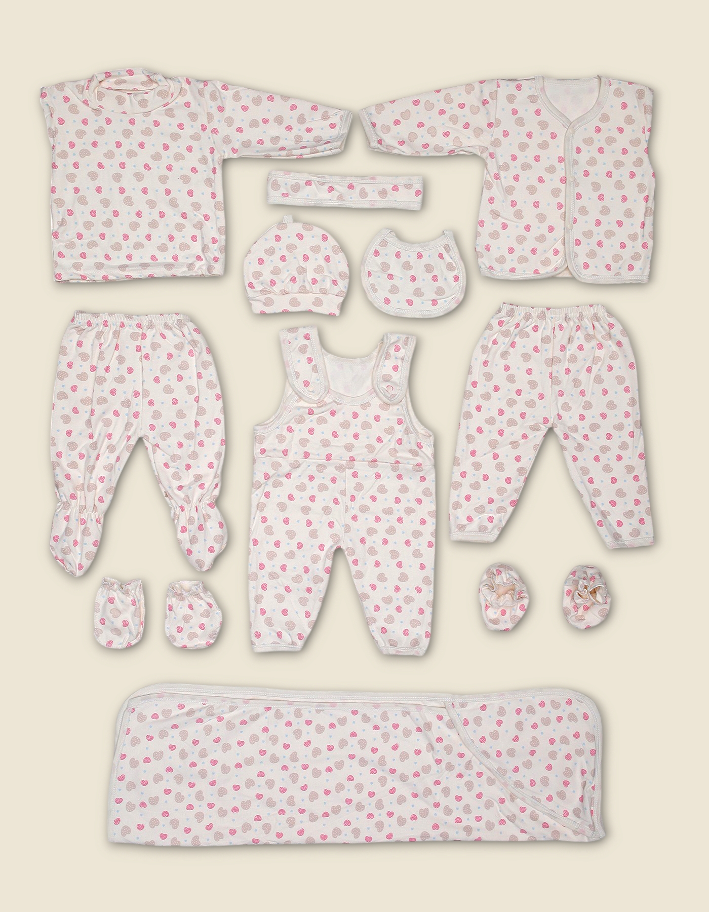 Complete newborn starter set with pink-beige polka dot print. Perfect for gifting and daily baby essentials