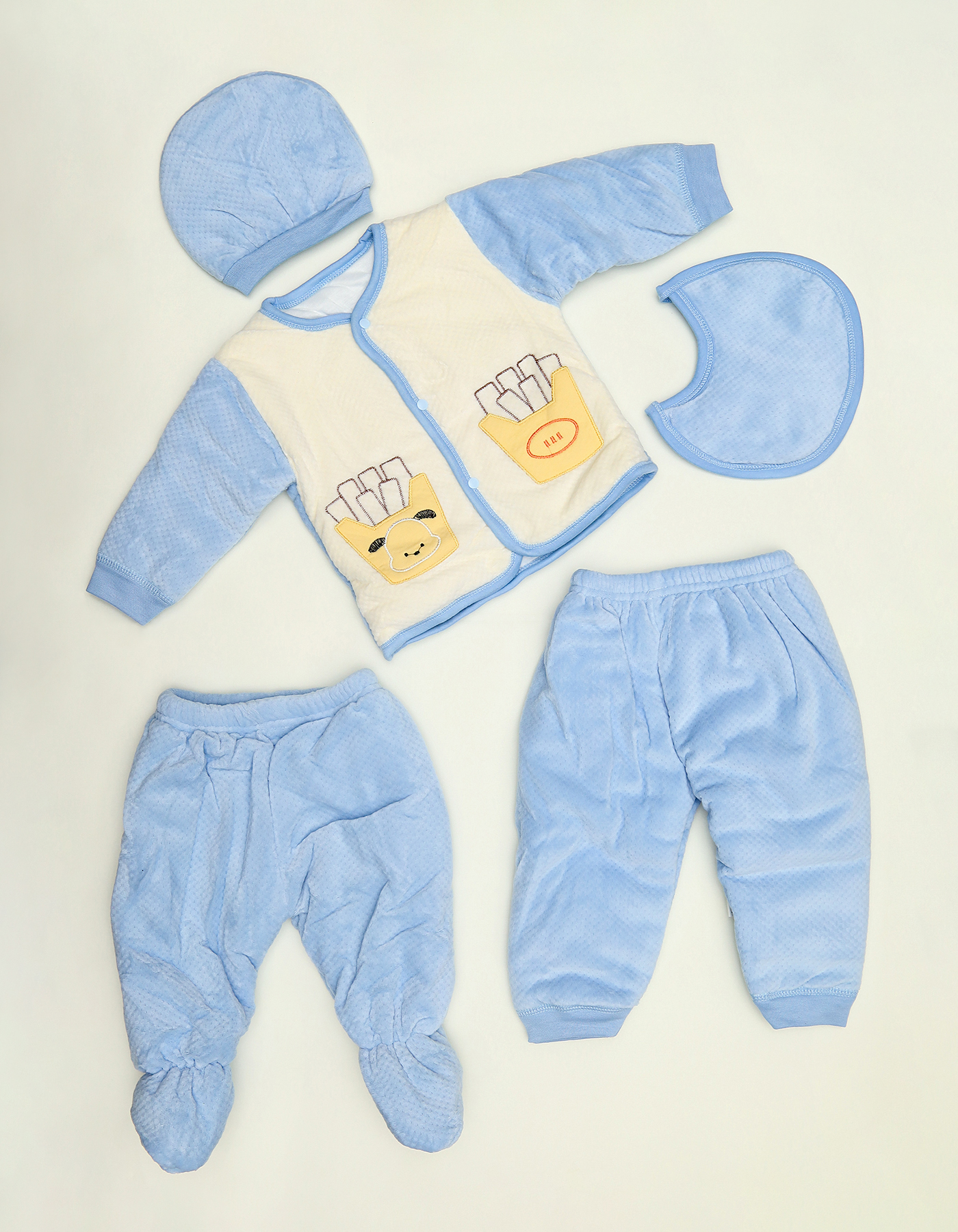 Complete newborn starter set in Sky Blue and Grey. Includes jacket, two pants, bib, and cap. Soft fleece fabric ensures comfort and style for daily wear.