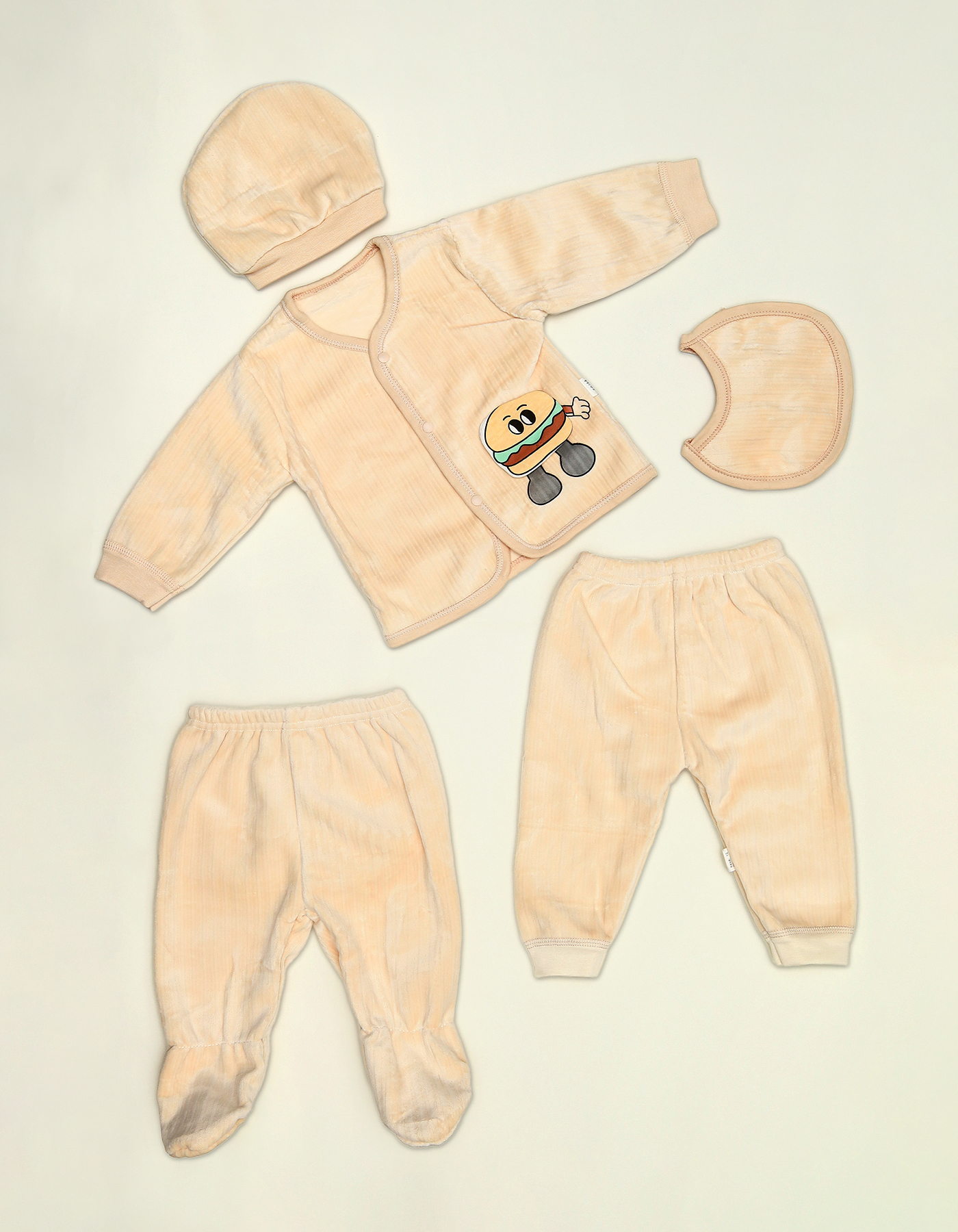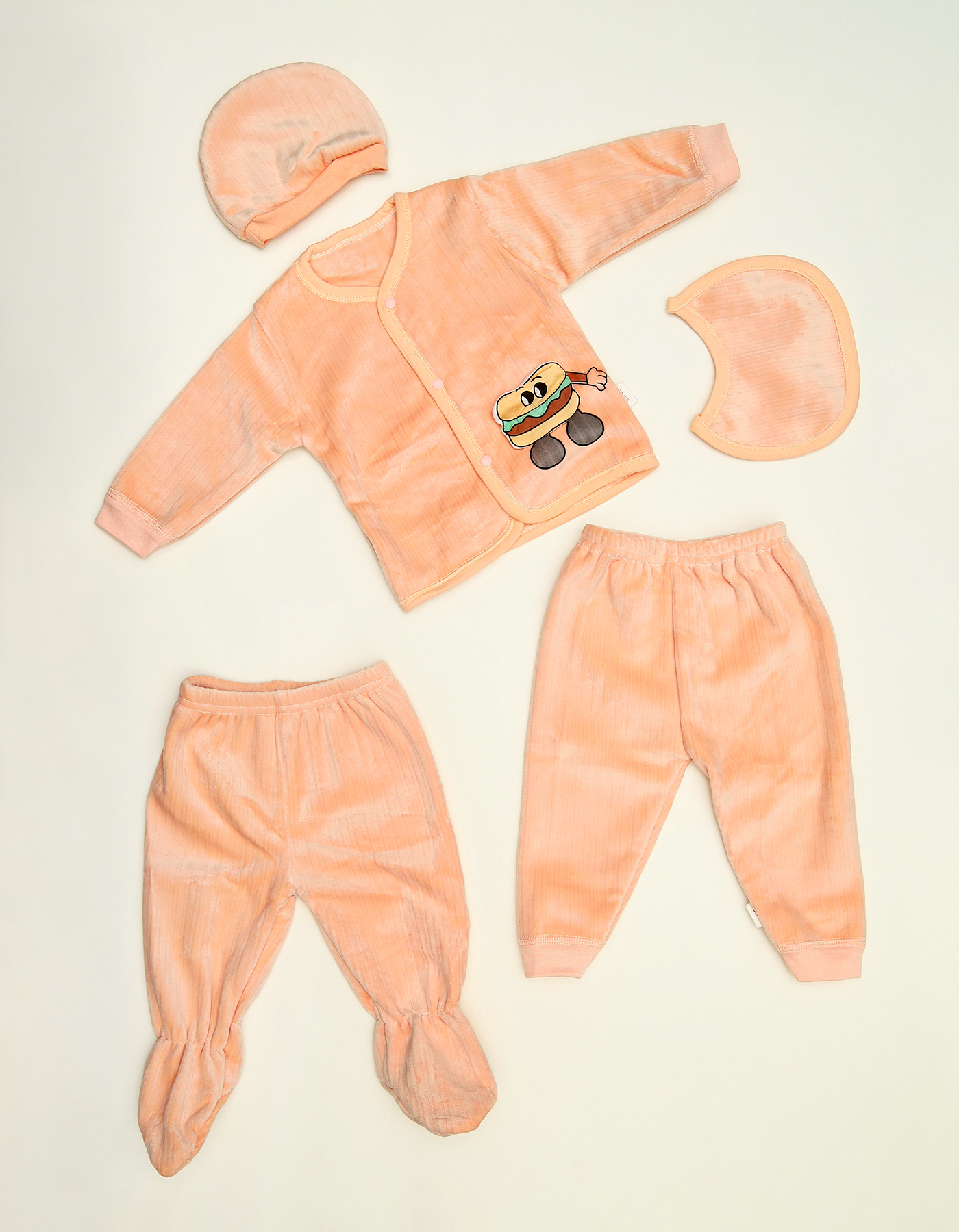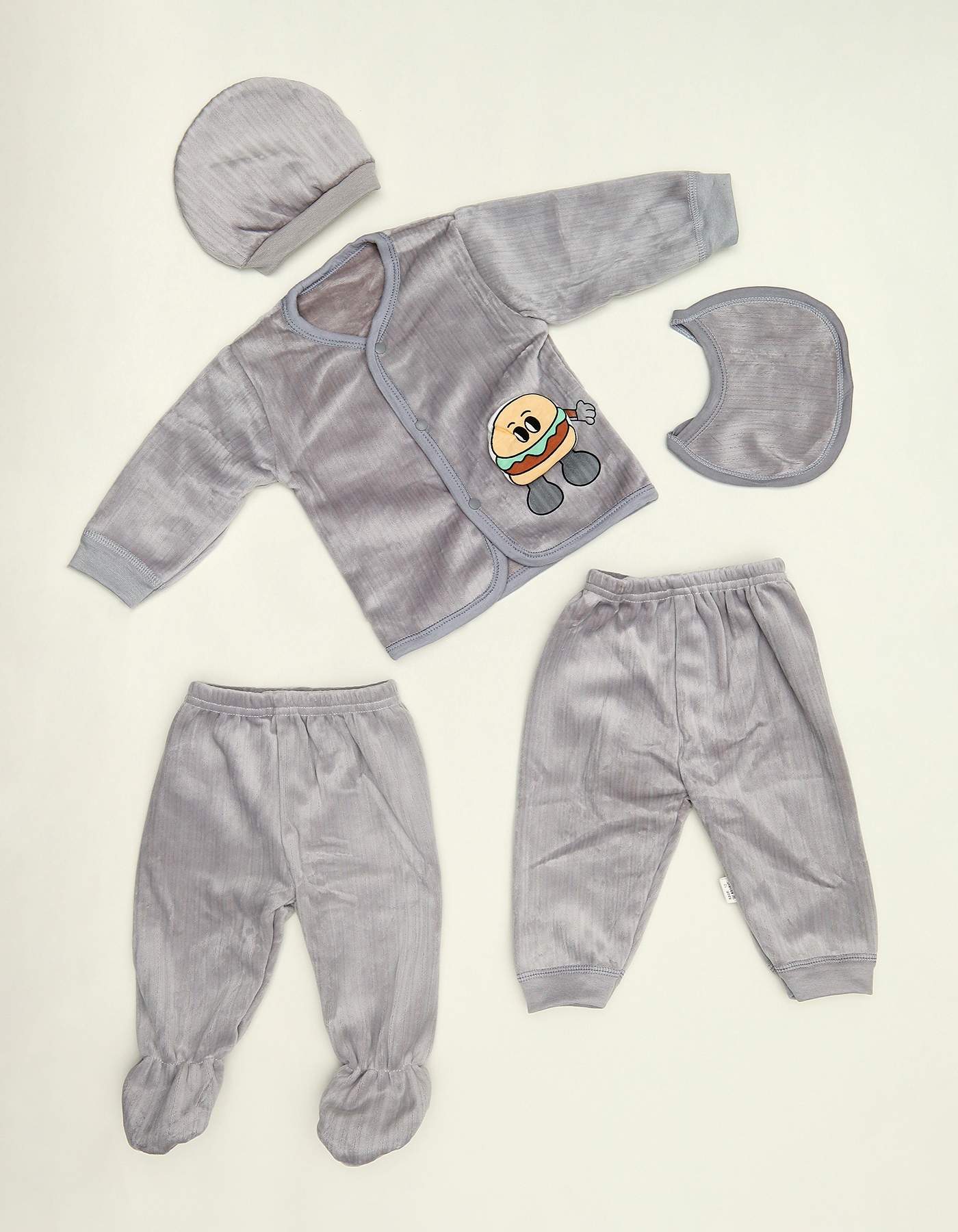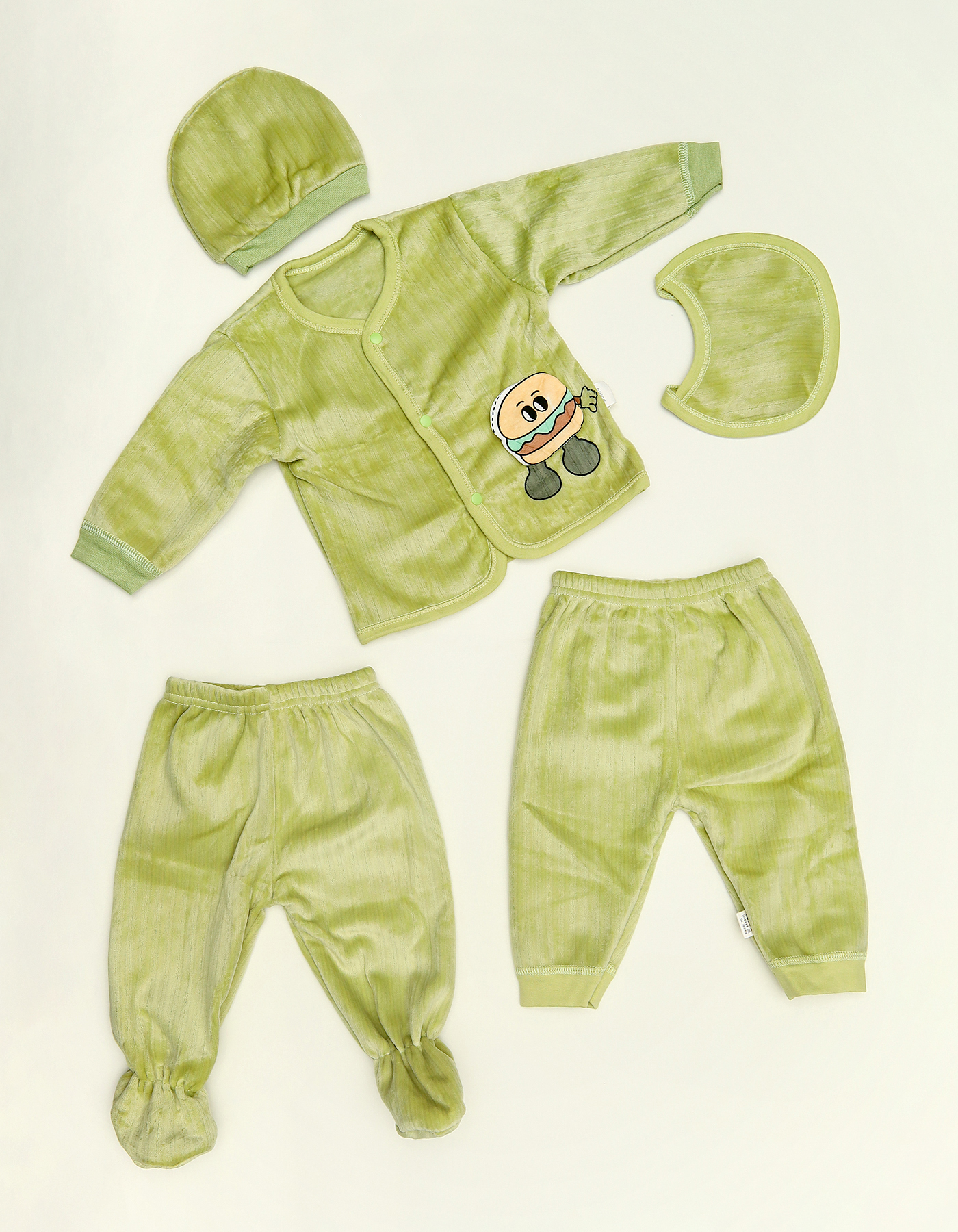 Complete newborn starter set available in Green, Peach, Skin, and Grey. Includes a buttoned jacket, two pants, bib, and cap for everyday comfort.