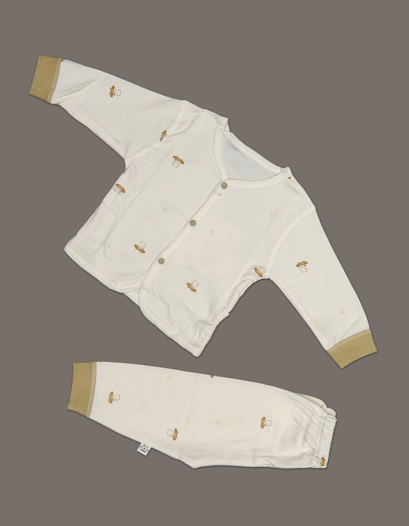 This 2-piece baby set is designed for comfort and style. The front-open snap button shirt ensures quick dressing, while the matching pajama with mustard cuffs adds a charming contrast.