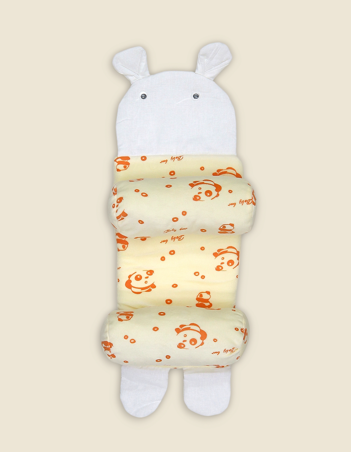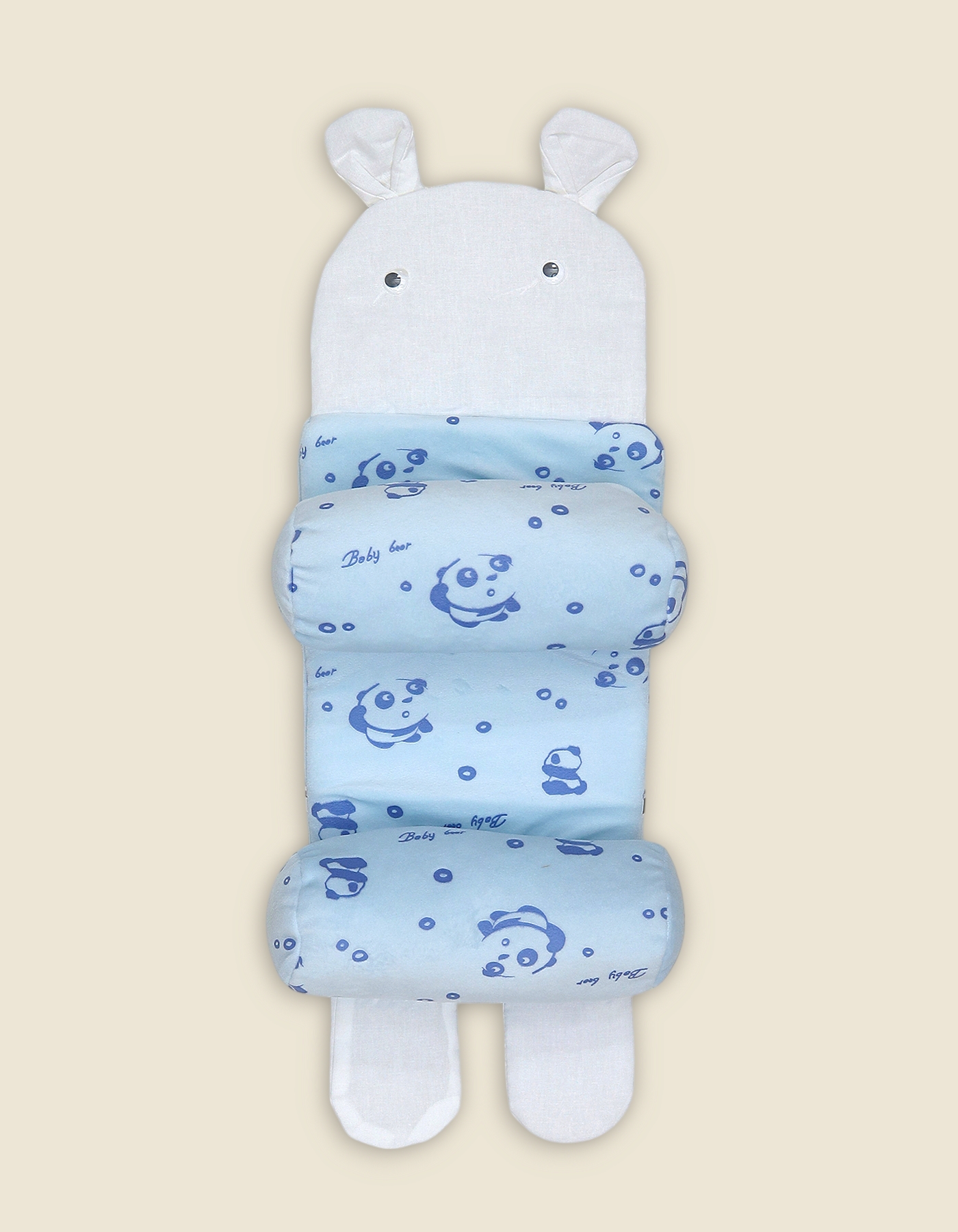 This adorable panda-themed sleep positioner features a cute character head with 3D ears and two adjustable side bolsters to keep your baby snugly in place. The soft, printed fabric features playful "Baby Bear" and panda motifs, providing a secure and cozy environment for naptime.