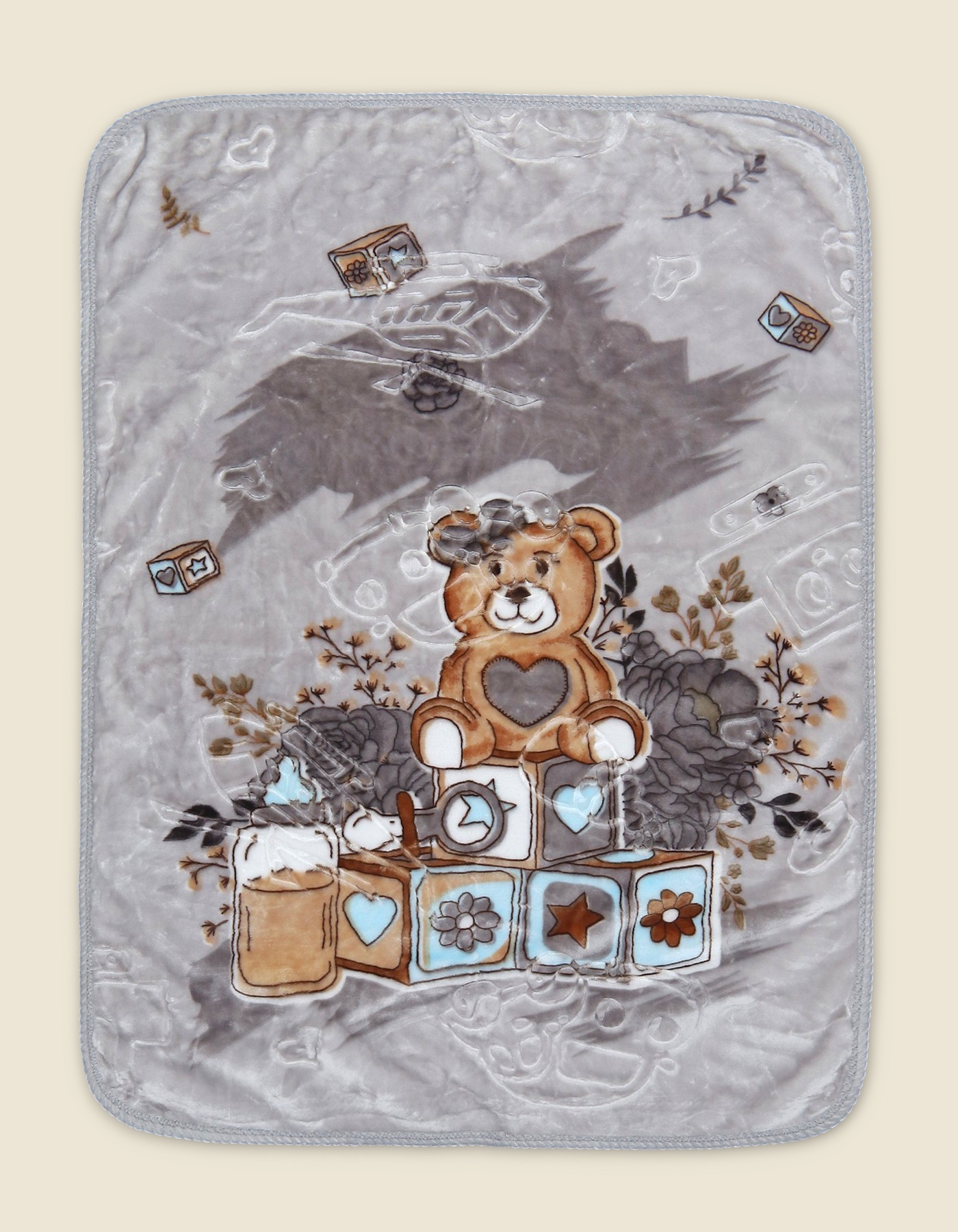 Comfortable and cozy baby blanket with teddy bear and toy block design in soft blue tones. Perfect for nursery crib or gifting.