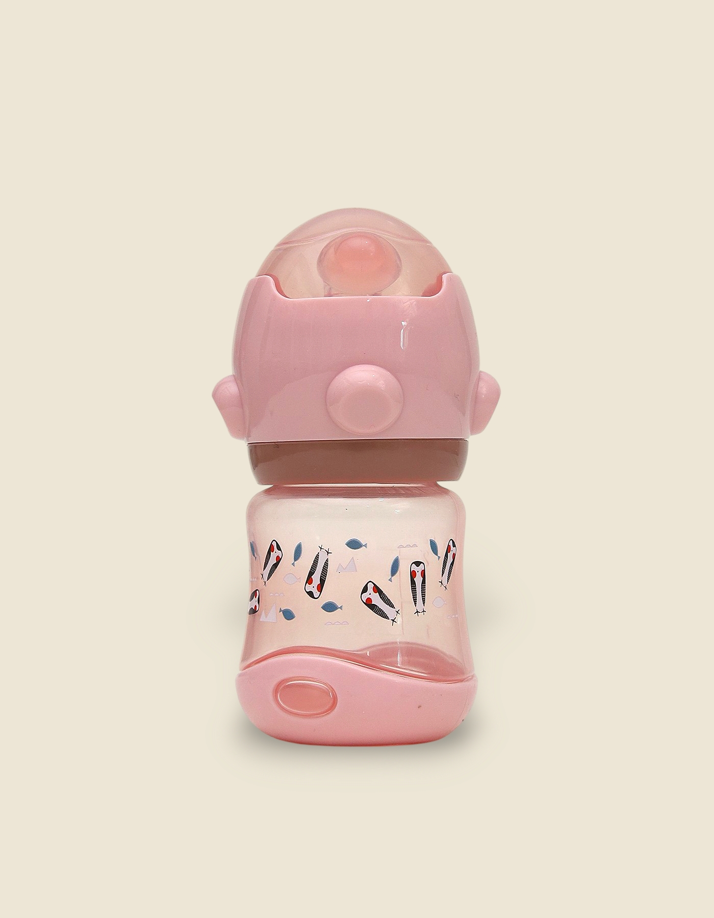 Playful Patterning: The bottles are decorated with charming, repeating nature-inspired prints, including small birds, floral elements, and stylized fish patterns.