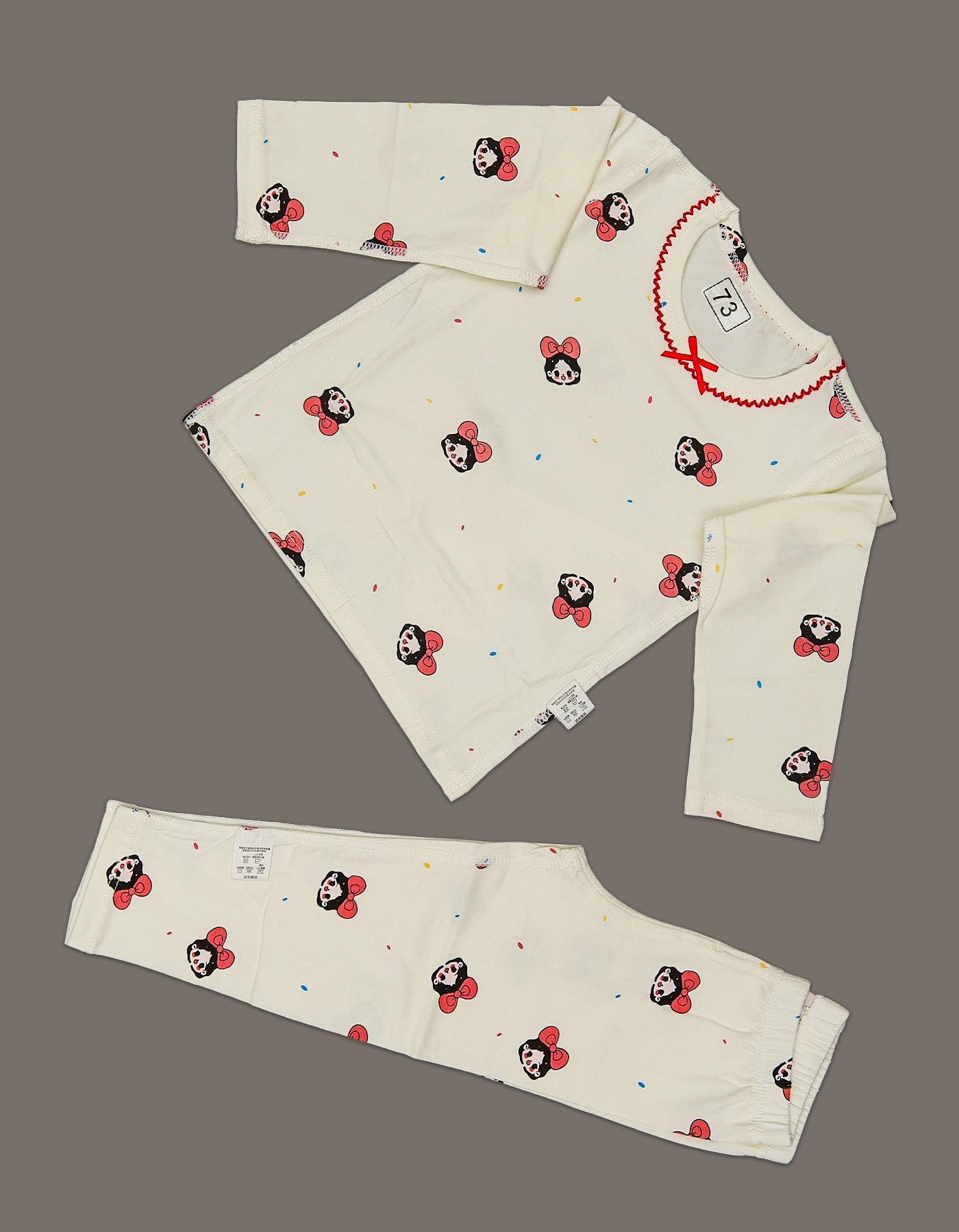 Charming and playful, this girls suit is designed with an adorable cartoon face and bow print all over. With its off-white base and red neckline detail, its perfect for stylish everyday wear.