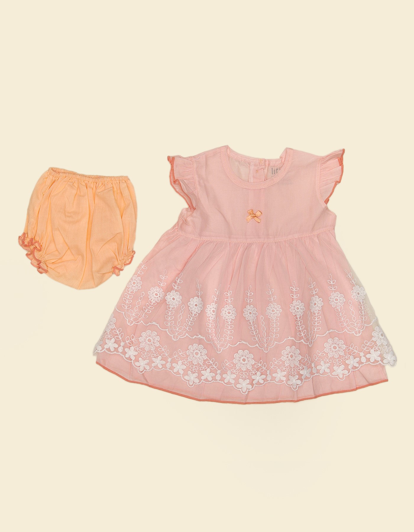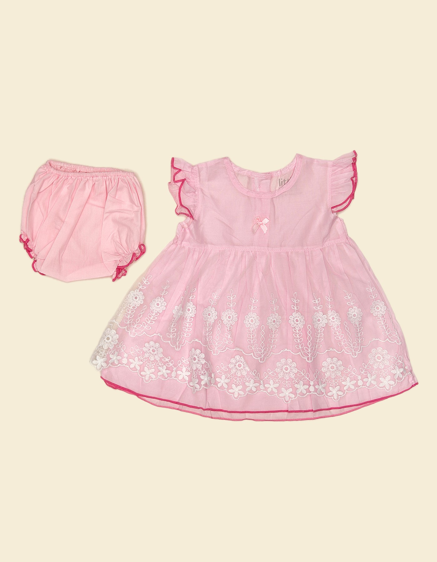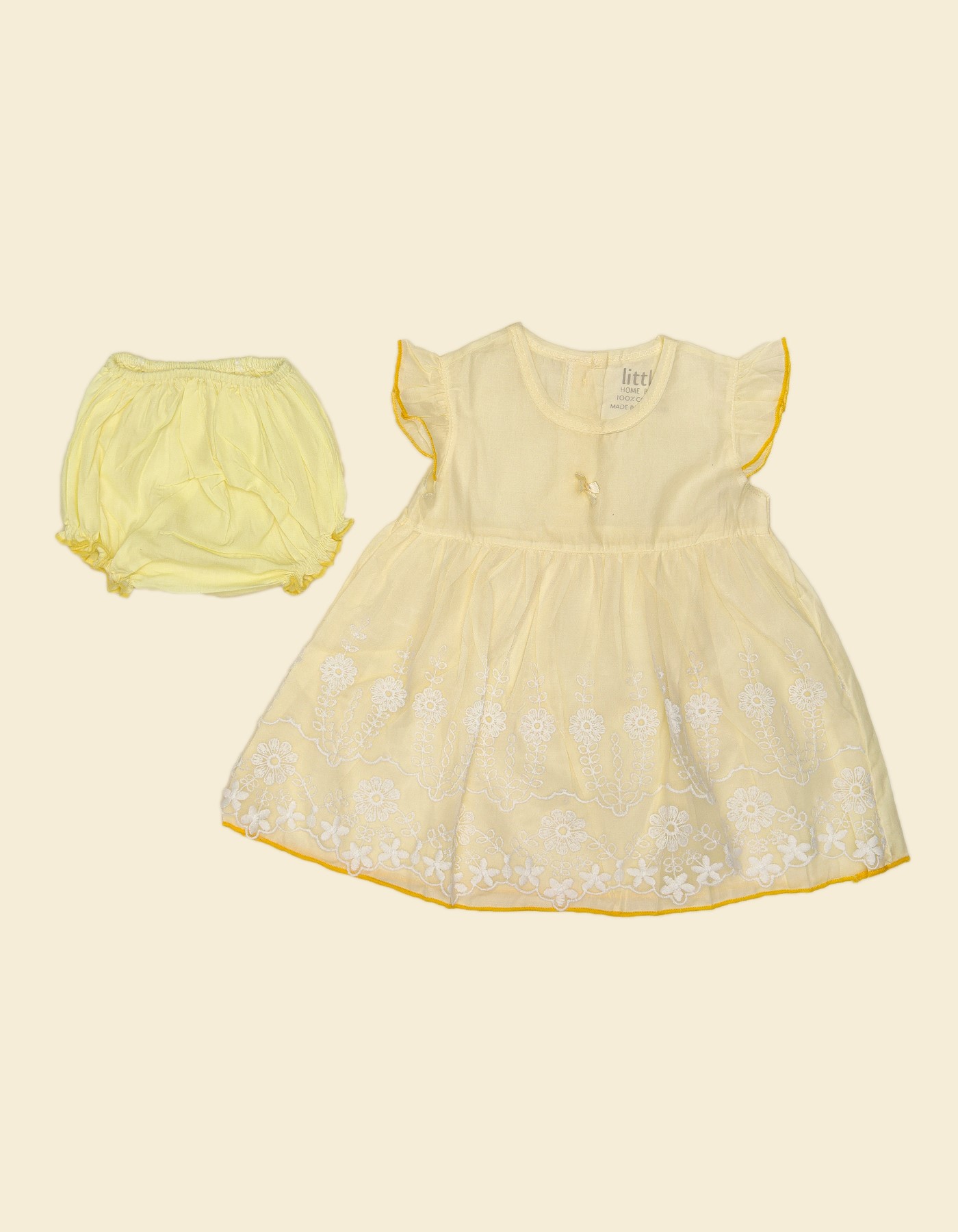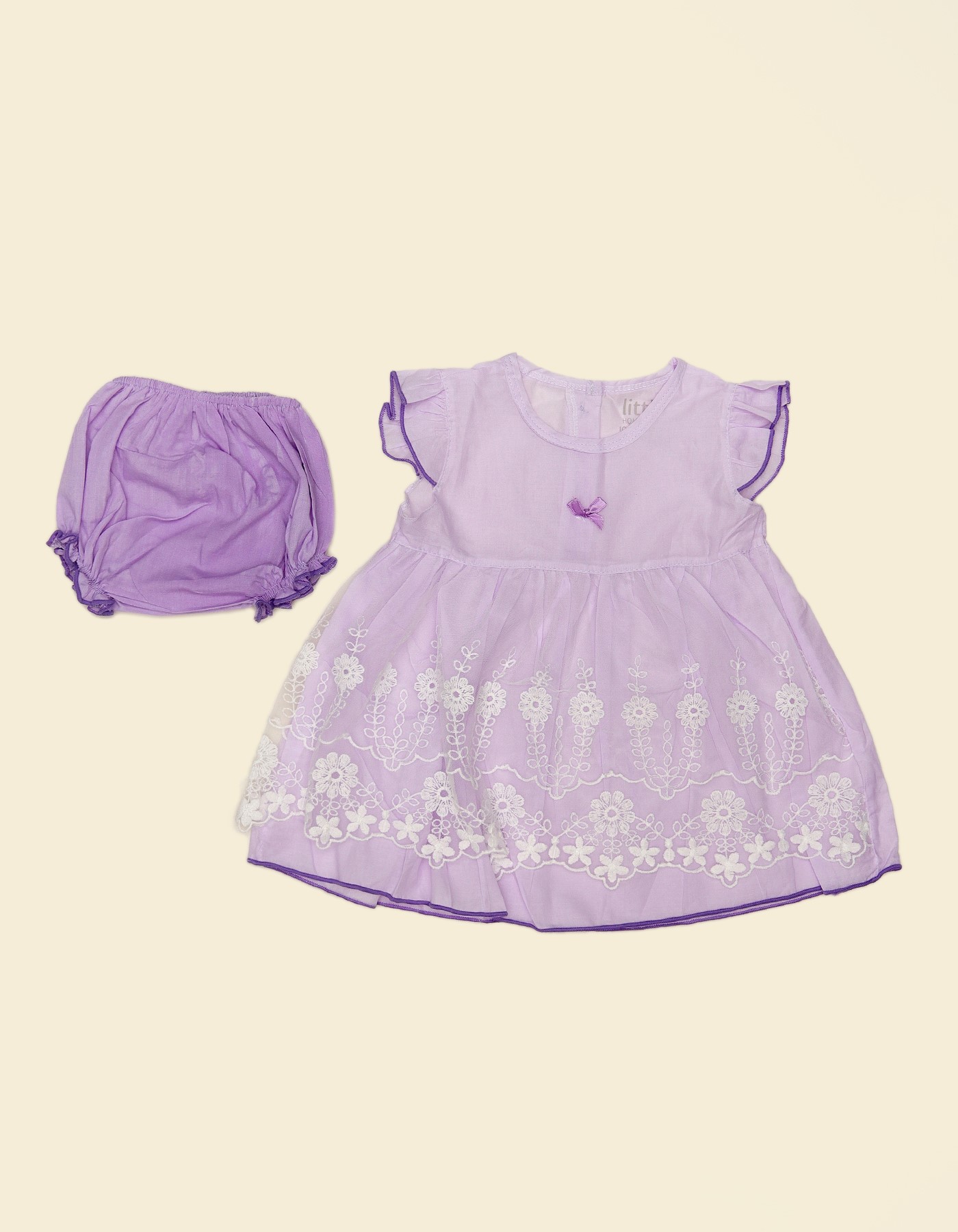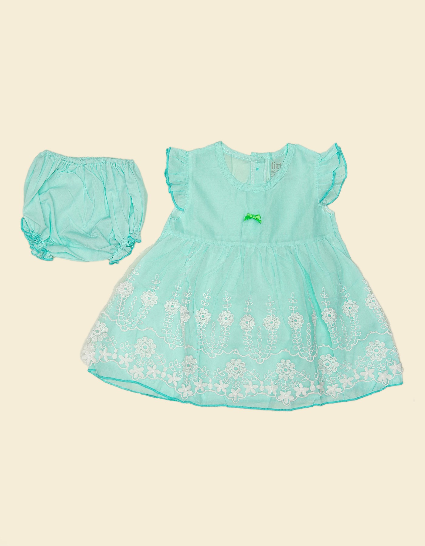 Make your little girl shine with this elegant baby party dress, perfect for birthdays, weddings, and special occasions. The soft, lightweight fabric ensures comfort, while the delicate floral embroidery and ruffled sleeves add a touch of charm. Comes with a matching bloomer for a complete outfit. Available in 6 beautiful colors to match every occasion.