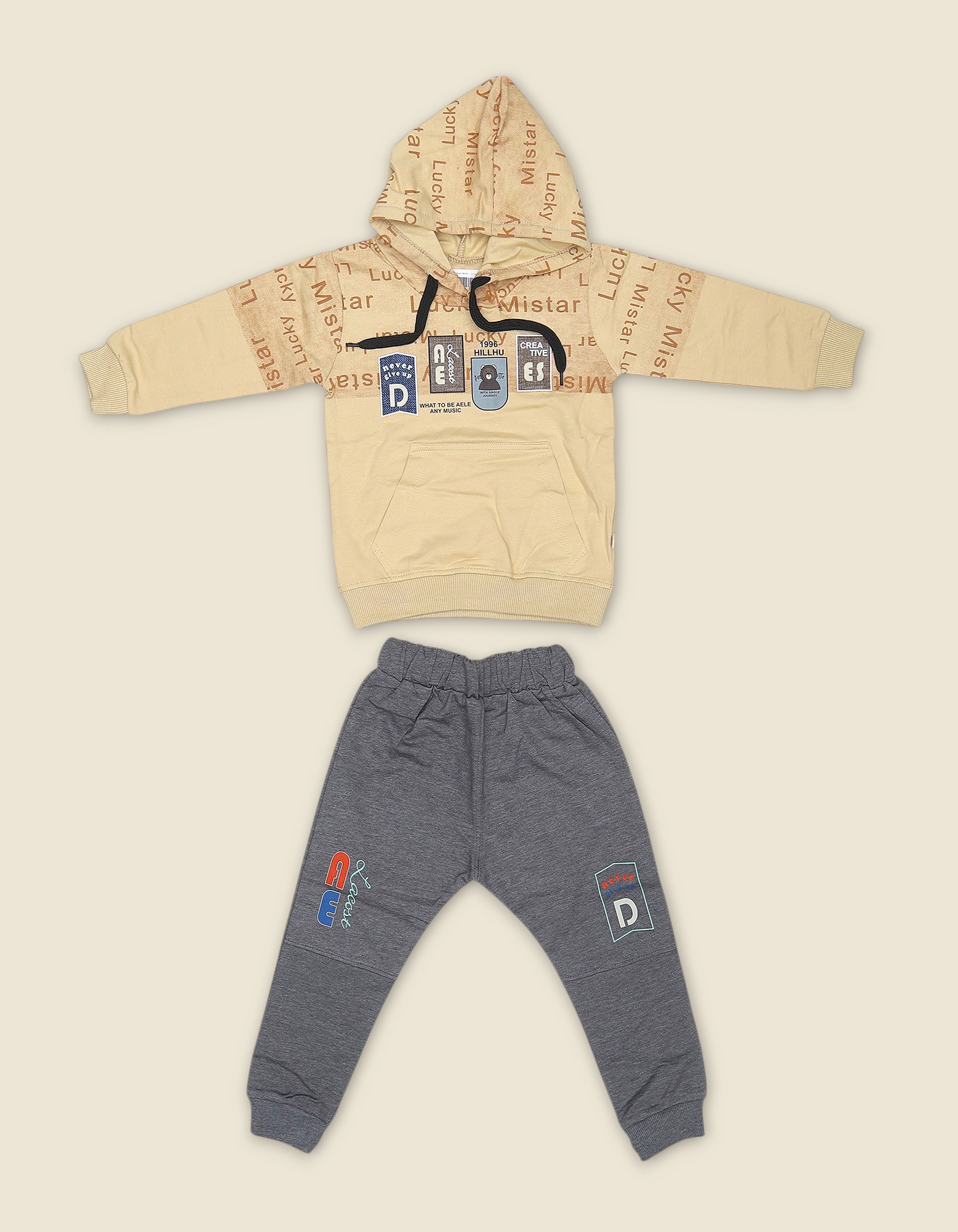 Comfortable baby outfit with hooded sweatshirt and matching pants. Features bold printed letters and coordinated design for a trendy look.