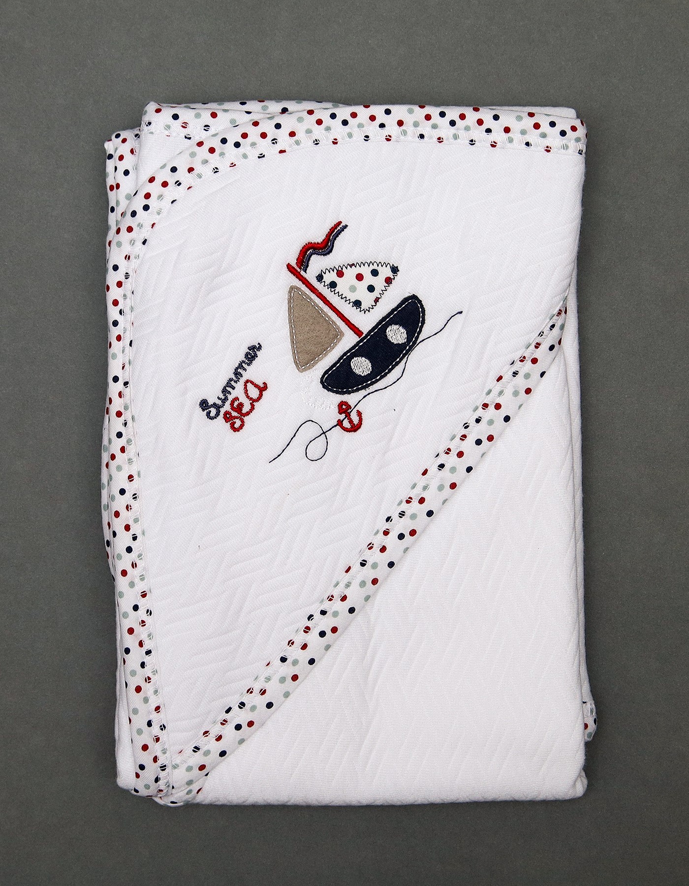 PureSail Newborn Hooded Shawl Soft quilted newborn shawl with embroidered sailboat motif and playful polka dot trim. Gentle on baby skin, perfect for bath time, swaddling and stroller use.