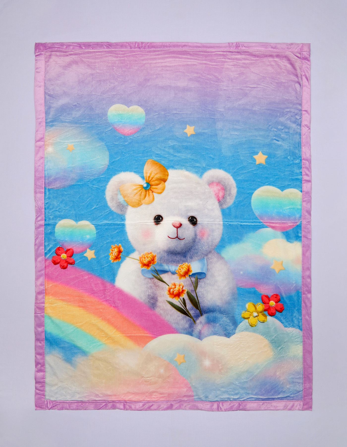 Bring magic and comfort to your little one's naps with our Rainbow Bear Baby Blanket — featuring a soft, dreamy pastel design of a cuddly bear surrounded by rainbows, hearts, and stars. Perfect for snuggles anytime, anywhere.