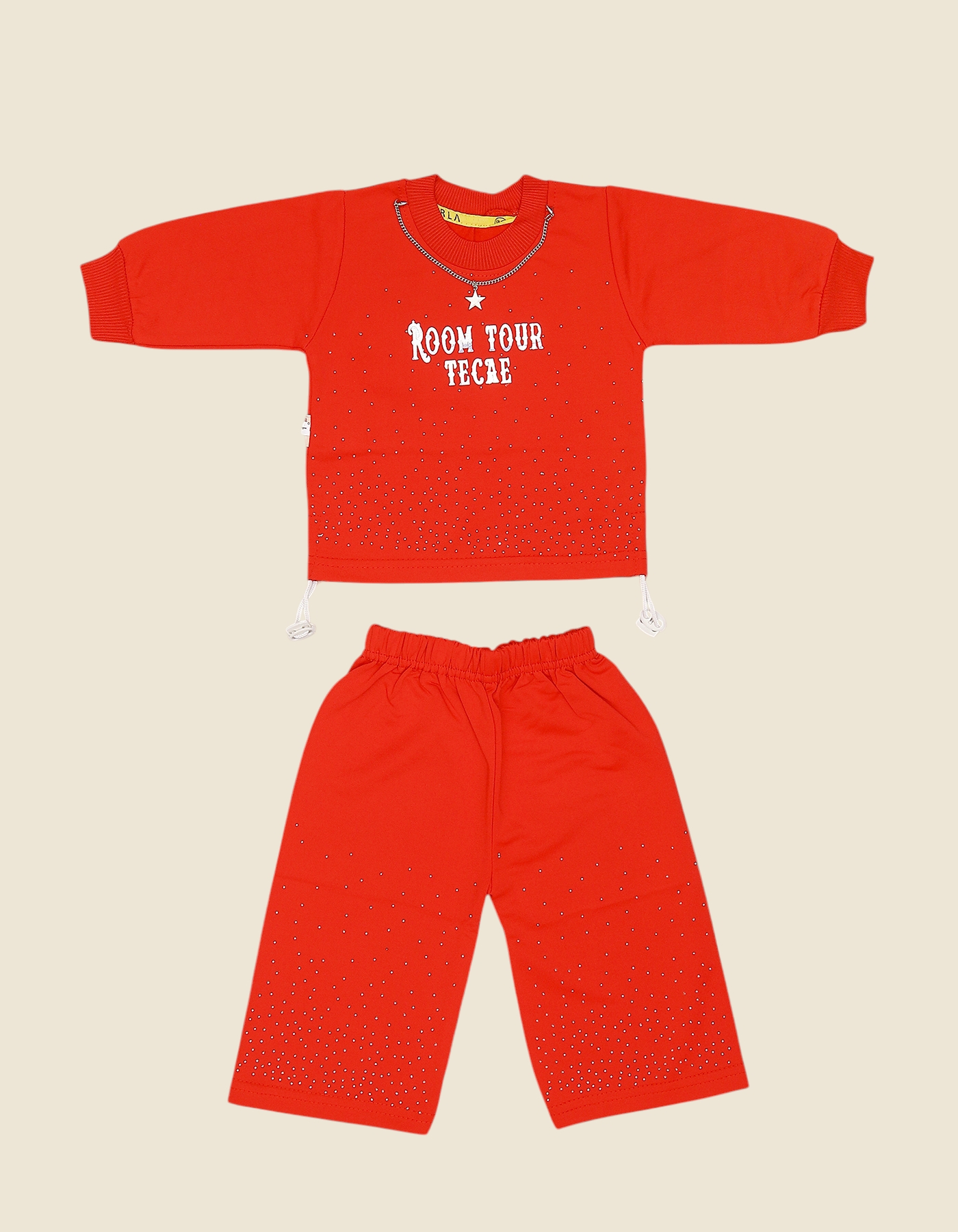 The Room Tour Sparkle Baby Outfit Set adds a trendy and stylish vibe to your little one everyday look. Featuring a long-sleeve sweatshirt with glittery rhinestone-style accents and matching wide-leg pants, this outfit is both fashionable and comfortable. Designed with soft, breathable fabric, it perfect for casual outings, parties, or cozy home wear. Available in Black and Red colors.