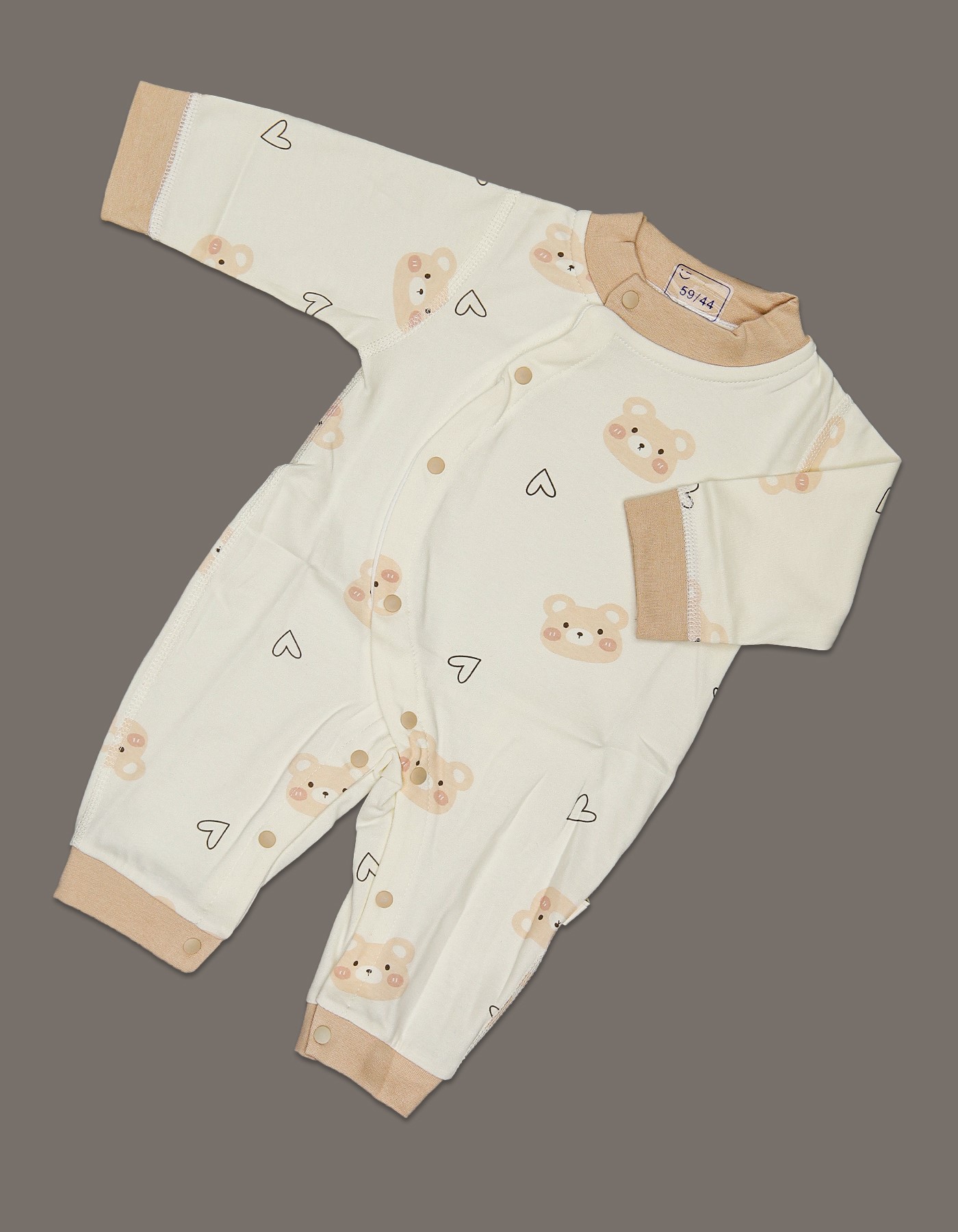 Dress your little one in cozy cuteness with the Skin Teddy Baby Romper. Crafted from ultra-soft cotton, this romper features a sweet teddy bear and heart print in soft skin tones, making it perfect for everyday comfort. With front snap buttons, it allows quick and hassle-free dressing and diaper changes, keeping both parents and babies happy.