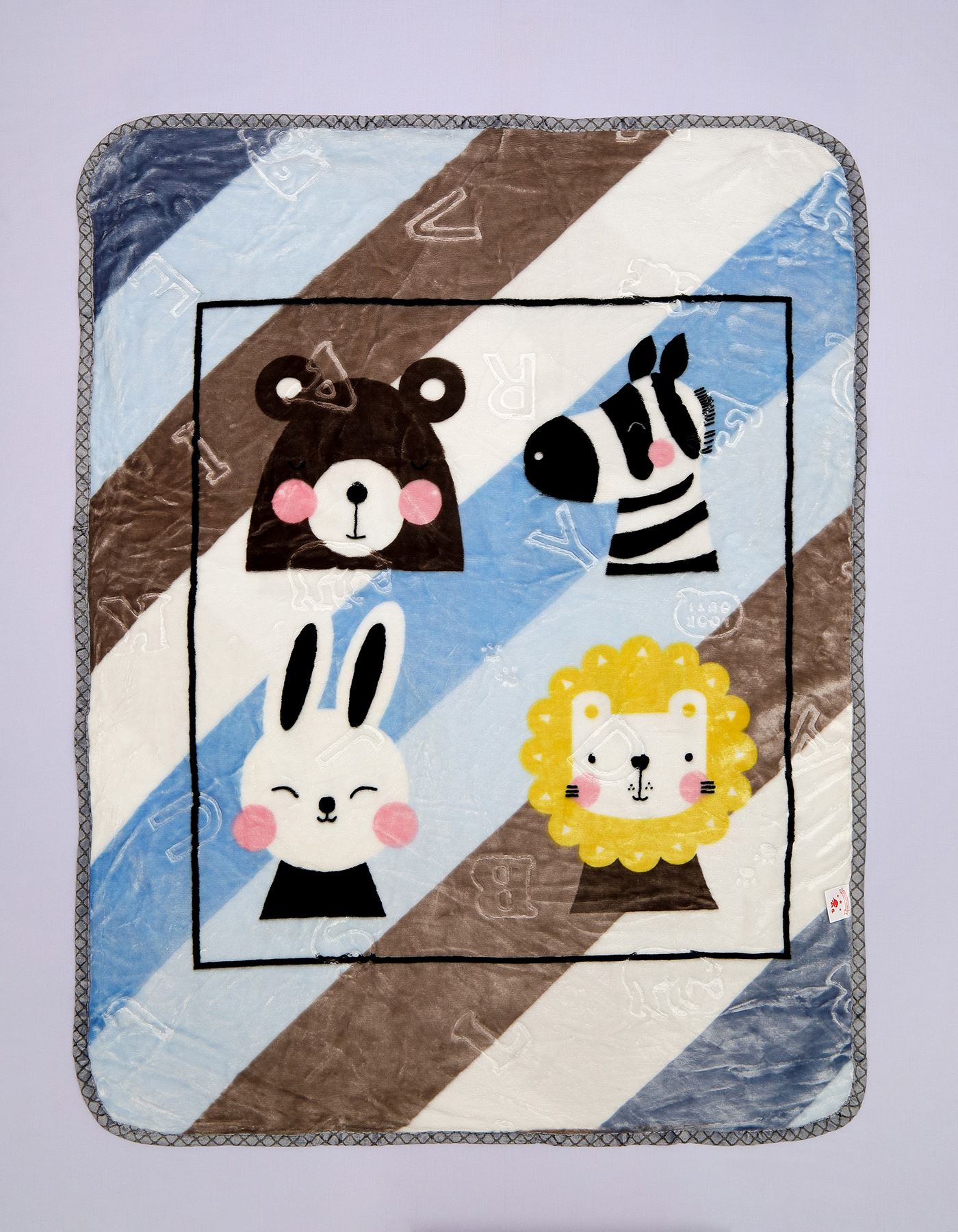 Keep your little one cozy and stylish with this plush animal-themed baby blanket. Featuring adorable bear, zebra, bunny, and lion prints on a soft brown and blue striped background, this blanket is perfect for naptime, stroller rides, or snuggles. Its ultra-soft fabric ensures comfort and warmth while being gentle on your baby’s skin.