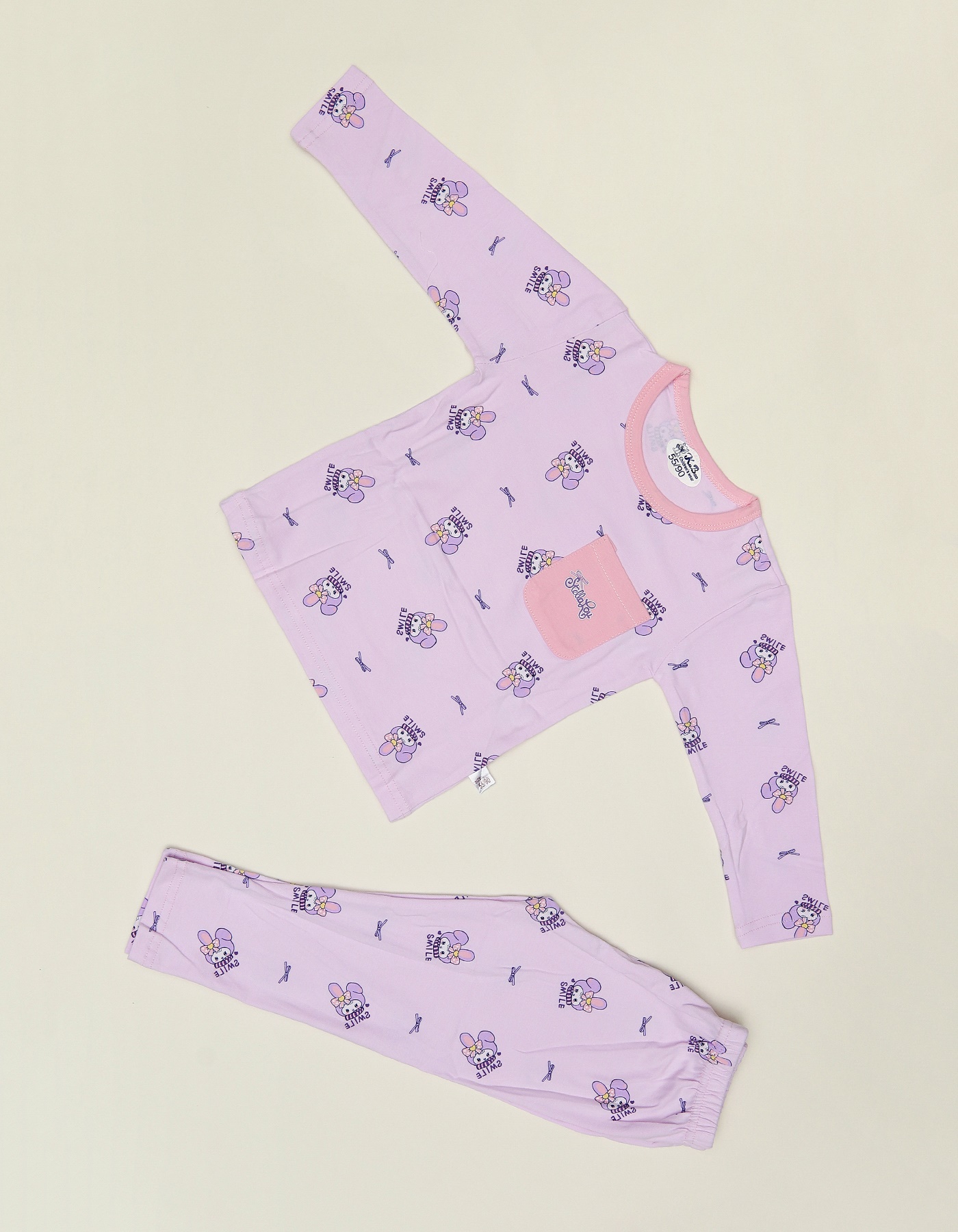 Add a touch of charm to bedtime with this Purple Cartoon Girls Suit. Designed with adorable cartoon mouse and bow prints, the set includes a comfy long sleeve top and matching pajama bottoms. A pink chest pocket adds a cute, stylish detail. Made from soft, breathable fabric, this pajama set ensures cozy comfort for sleeping, lounging, or playful evenings at home.