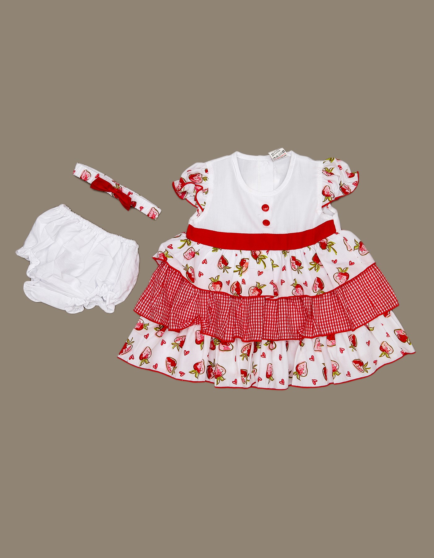 Bring out the sweetness in your little one with this Strawberry Charm Baby Frock Set in a striking red shade. This 3-piece outfit includes a beautifully layered frock with cute strawberry prints, a matching diaper cover, and an adorable bow headband. Crafted with soft, breathable fabric, this set ensures both comfort and cuteness for your baby, perfect for parties, photoshoots, and everyday charm.