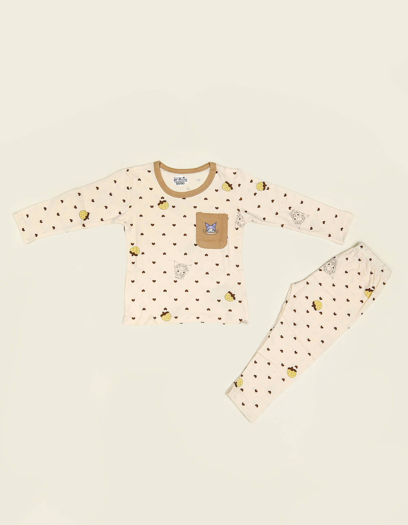 Make bedtime cozy and playful with this Skin Cartoon Print Girls Suit. Featuring cute little cartoon faces and heart patterns all over, the set includes a full sleeve top and matching bottoms. A stylish chest pocket with character embroidery adds extra charm. Crafted from soft, breathable fabric, this set ensures comfort all night long, making it perfect for sleep, lounging, or indoor play.