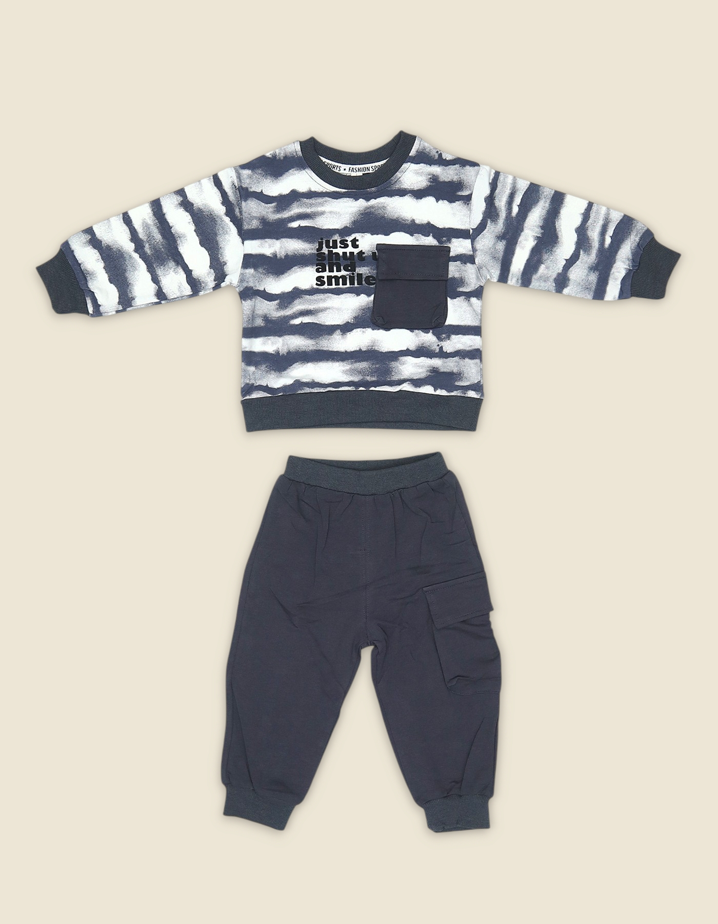 Three-piece kids outfit featuring a navy-and-white tie-dye striped sweatshirt with a flap chest pocket and navy cargo-style joggers. Comfortable ribbed trims, elastic waist, and playful graphic text make this an easy, on-trend set for everyday wear.