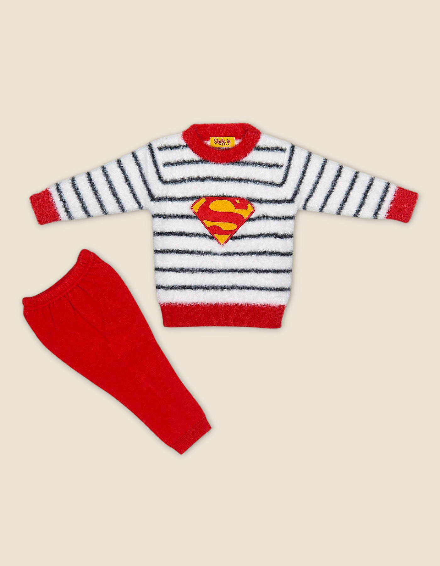 Bold woolen outfit for boys with Superman logo sweater and matching pants. Designed for warmth, comfort and superhero style.