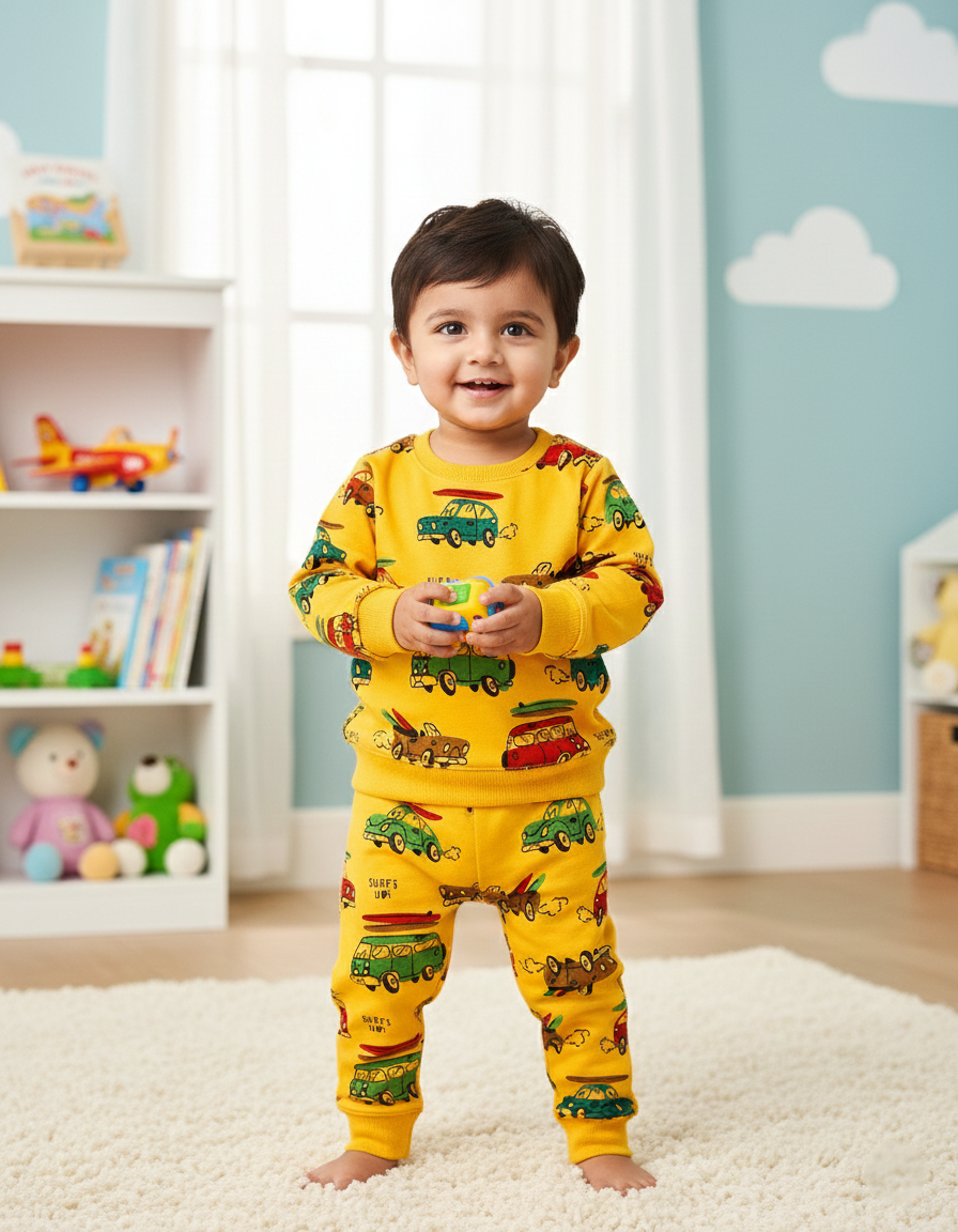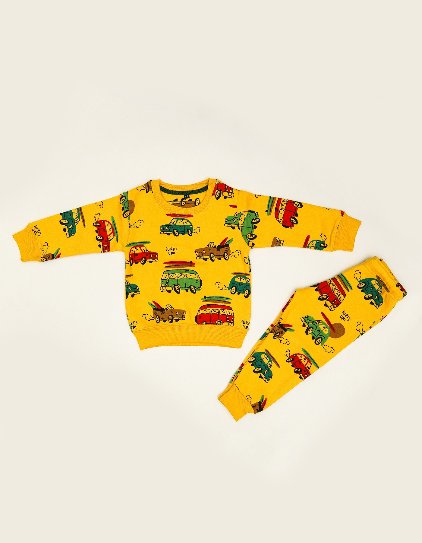 Add a fun pop of color to your child’s wardrobe with this playful boys printed tracksuit. Featuring vibrant car and van prints with a “Surfs Up” theme, this set is perfect for kids who love bright and cheerful outfits.