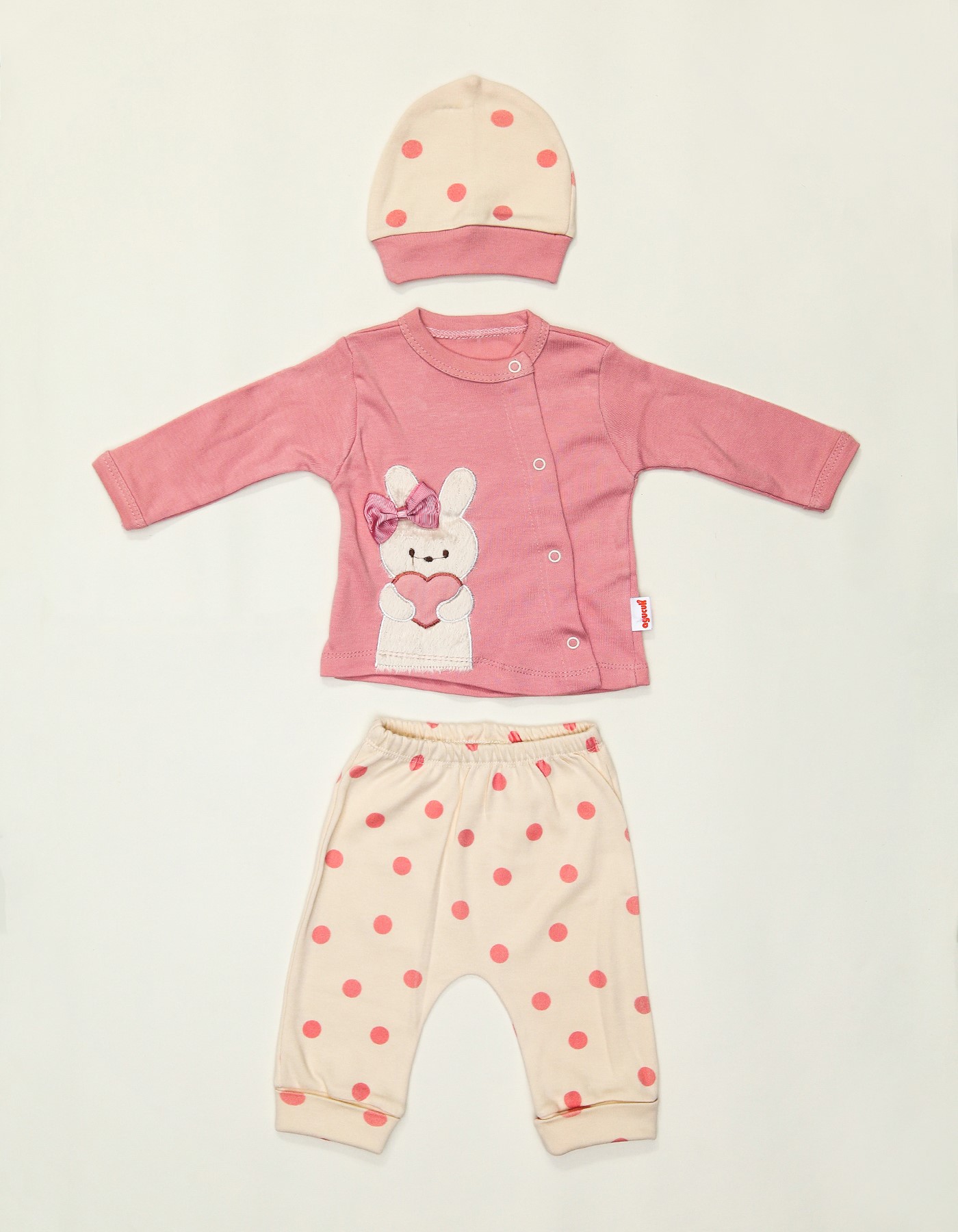 Dress your little one in the Sweet Bunny Love 3-Piece Baby Outfit, designed for both comfort and style. This adorable set includes a soft baby pink top with a cute bunny applique holding a heart, matching polka dot pants, and a cozy cap. Perfect for everyday wear or as a thoughtful gift, this outfit keeps your baby looking cute and feeling comfortable all day long.