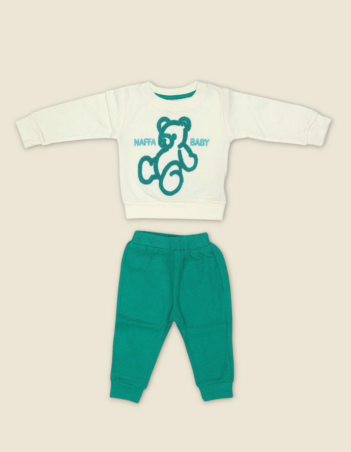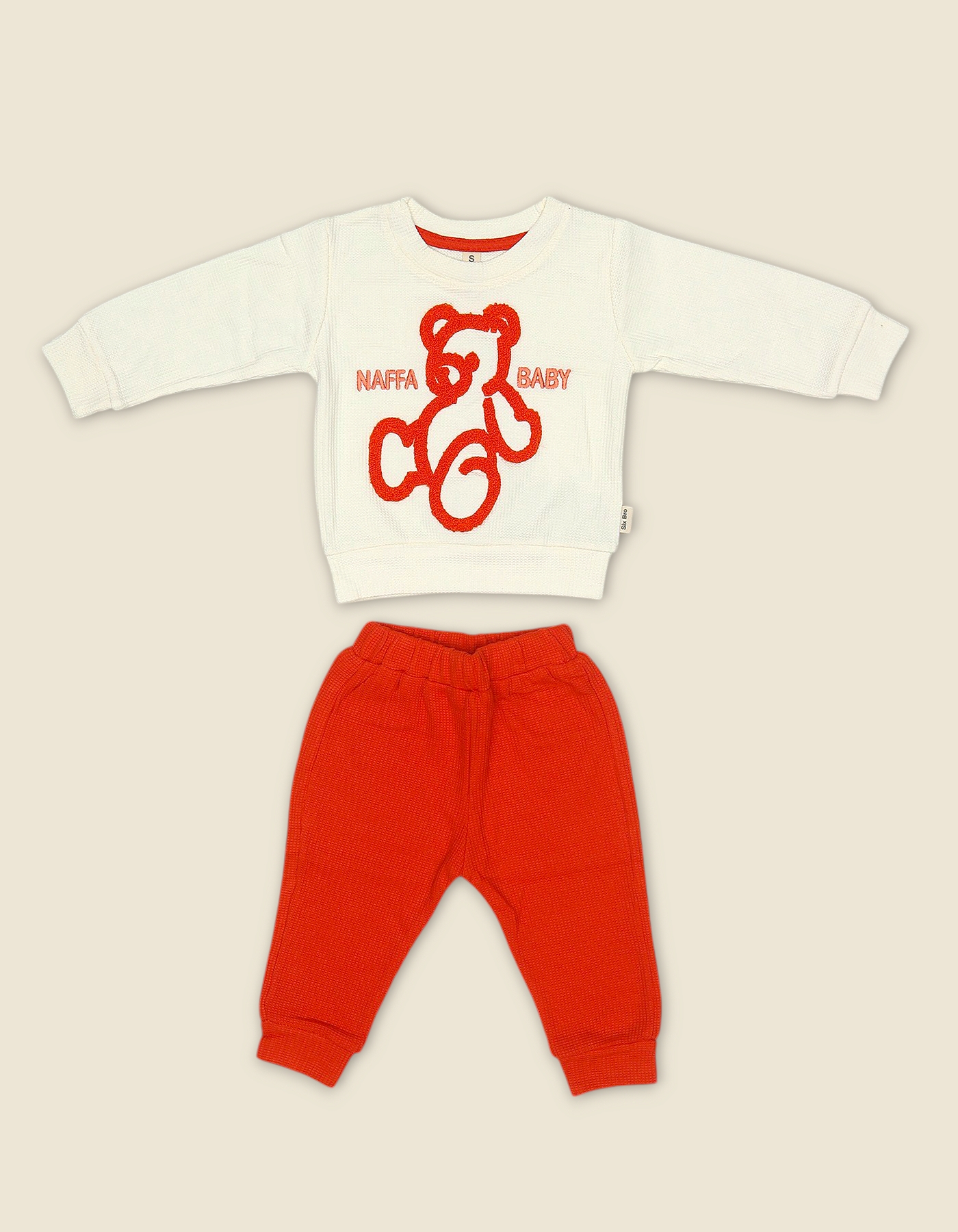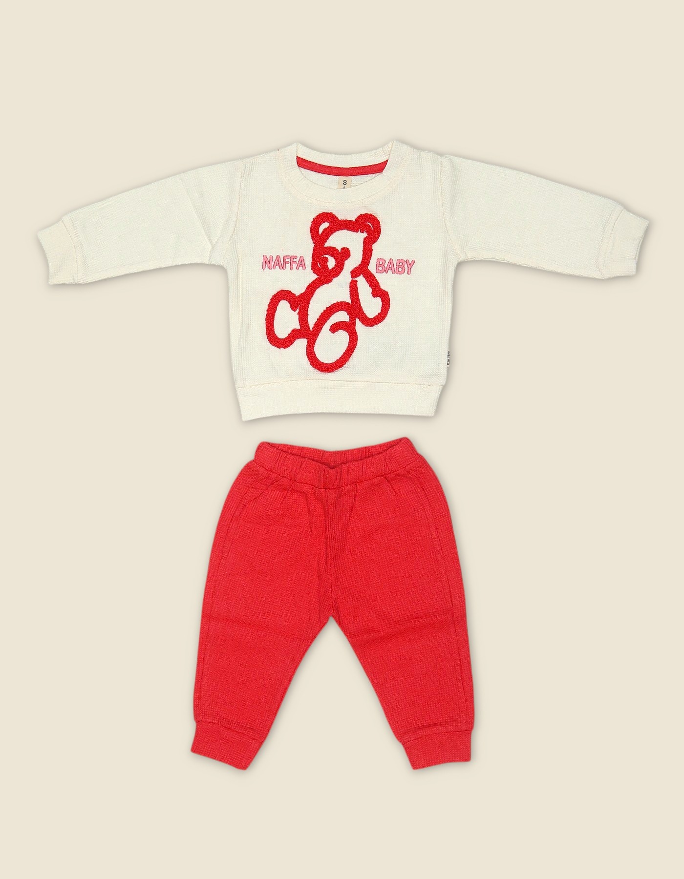 Soft and stylish baby outfit with teddy bear graphic and printed text. Includes long sleeve shirt and matching pants in bold colors.